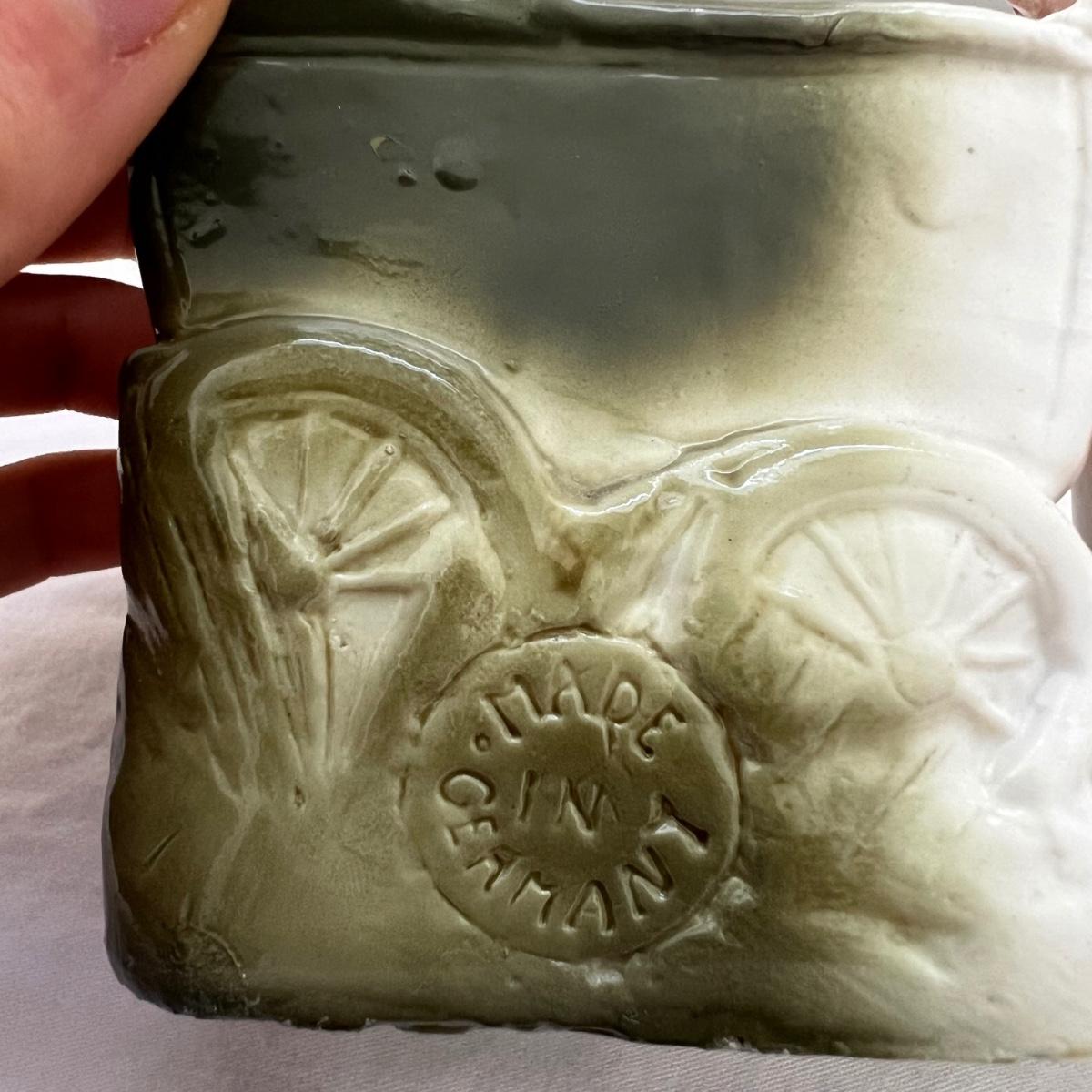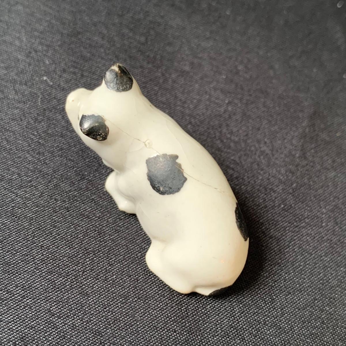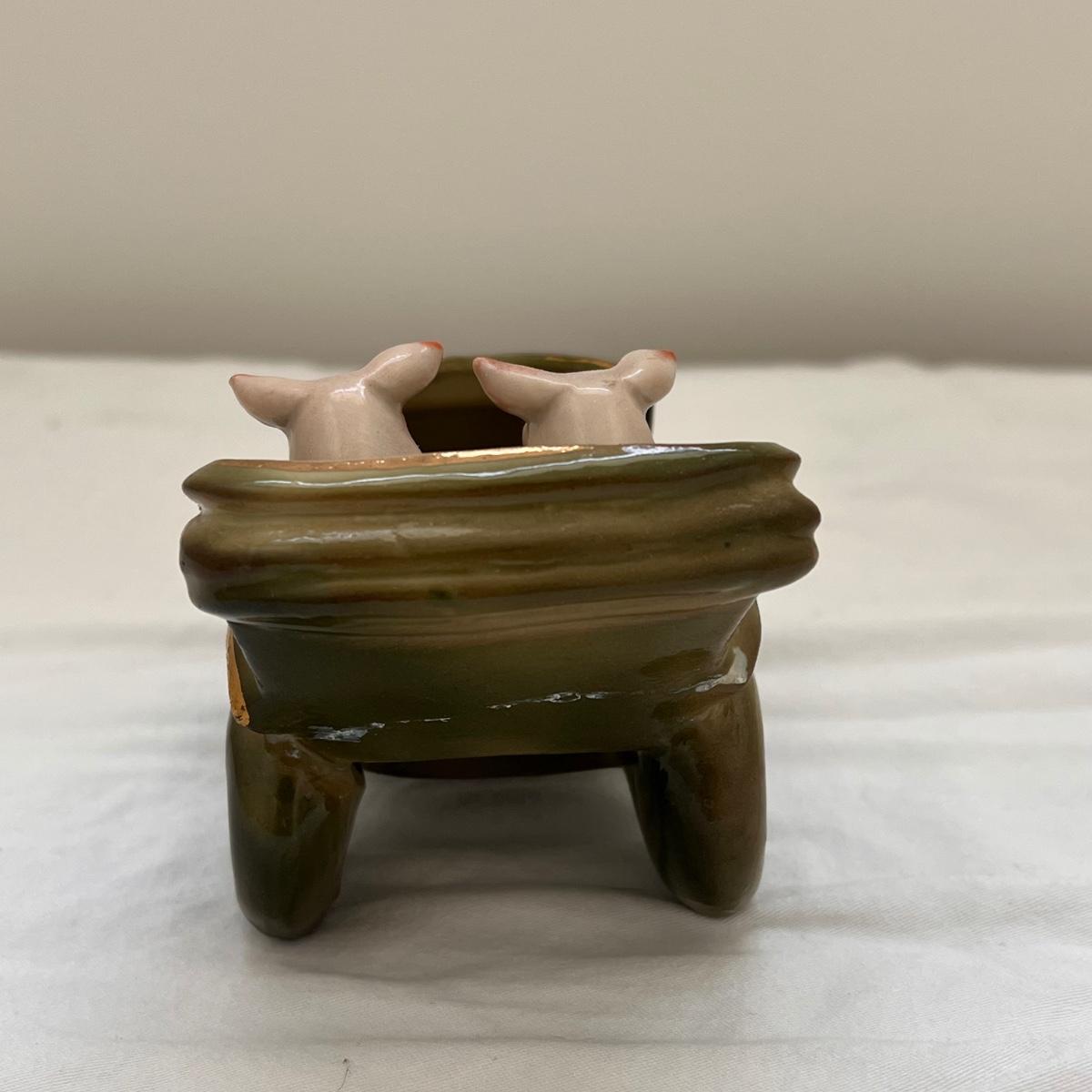 This lot includes six porcelain pig figurine collectibles. The larger three pieces appear to be made in Germany. The largest piece is "The Heavenly Twins," measuring 4" x 3.5"H. Three small black and white pigs are included as well. One has a small crack on its back. Shipping available.