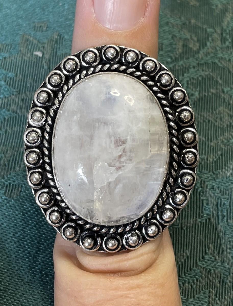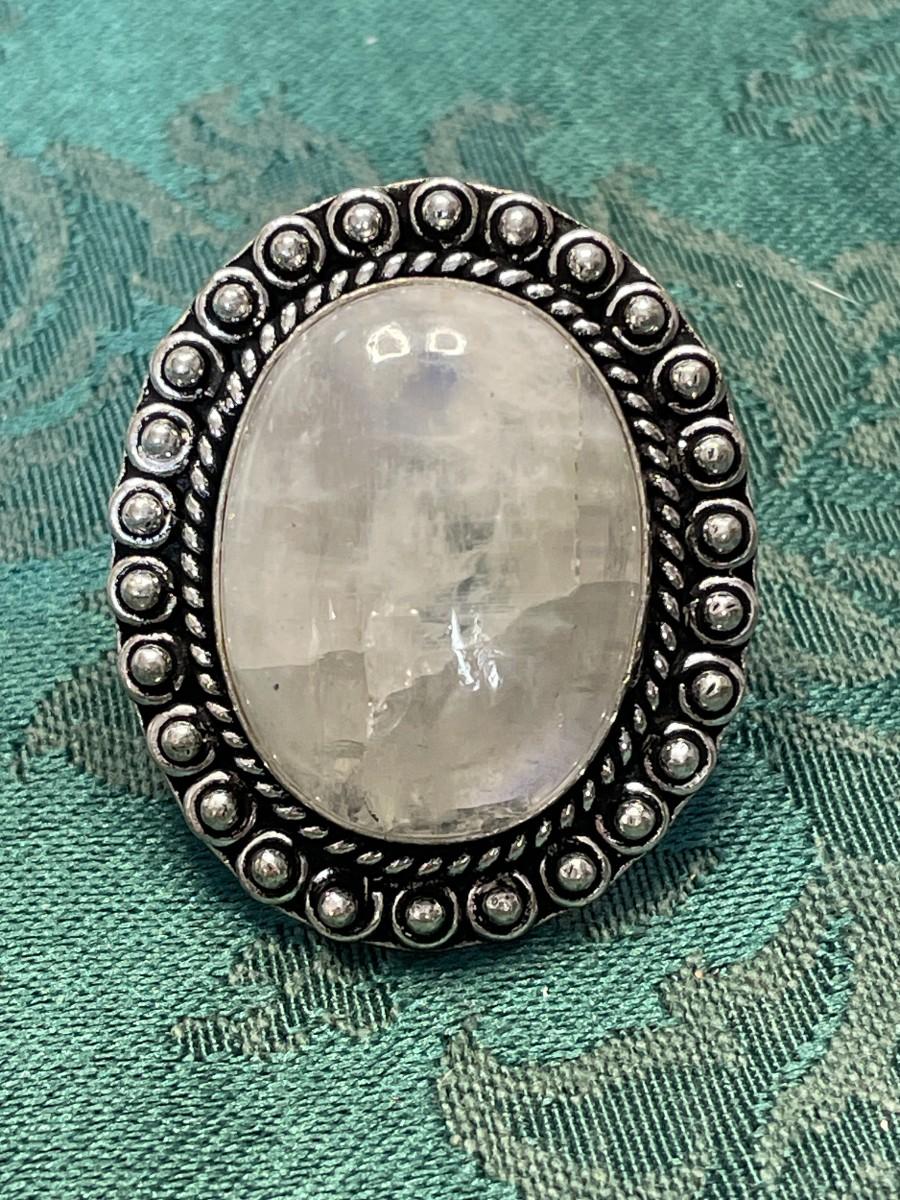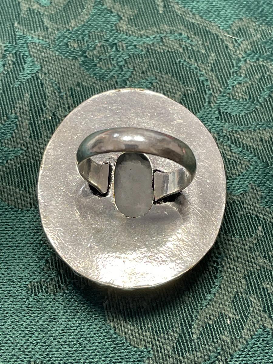 This ring is about a size 6.5. The setting is about 1.5" long (it is large). It is not marked, but the consignor was told that it is German silver.