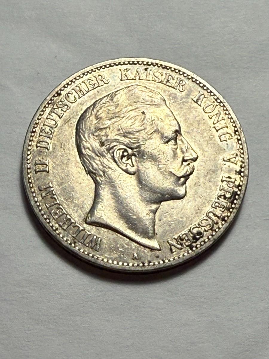 GERMAN STATES PRUSSIA 1907-A AU CONDITION 5 MARK .900 FINE SILVER COIN AS PICTURED.