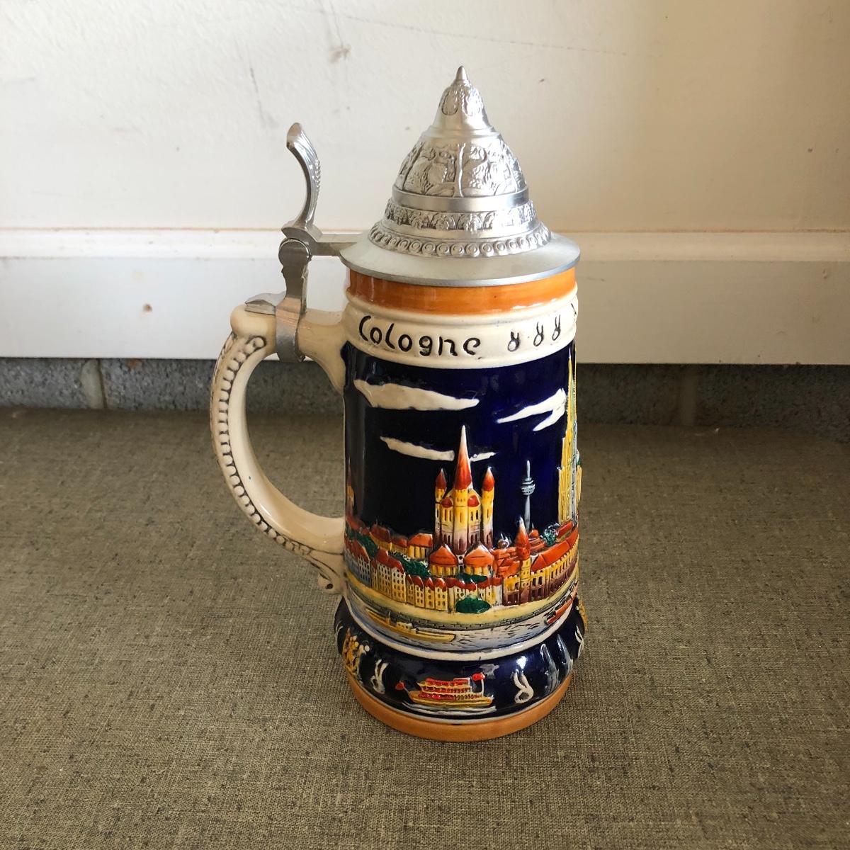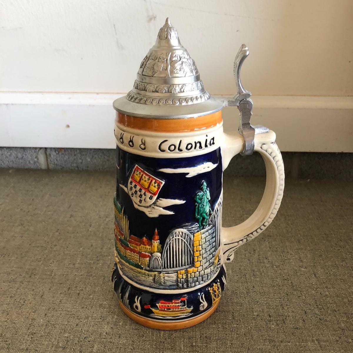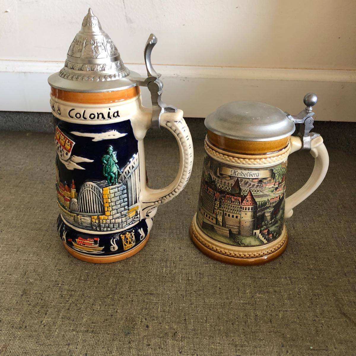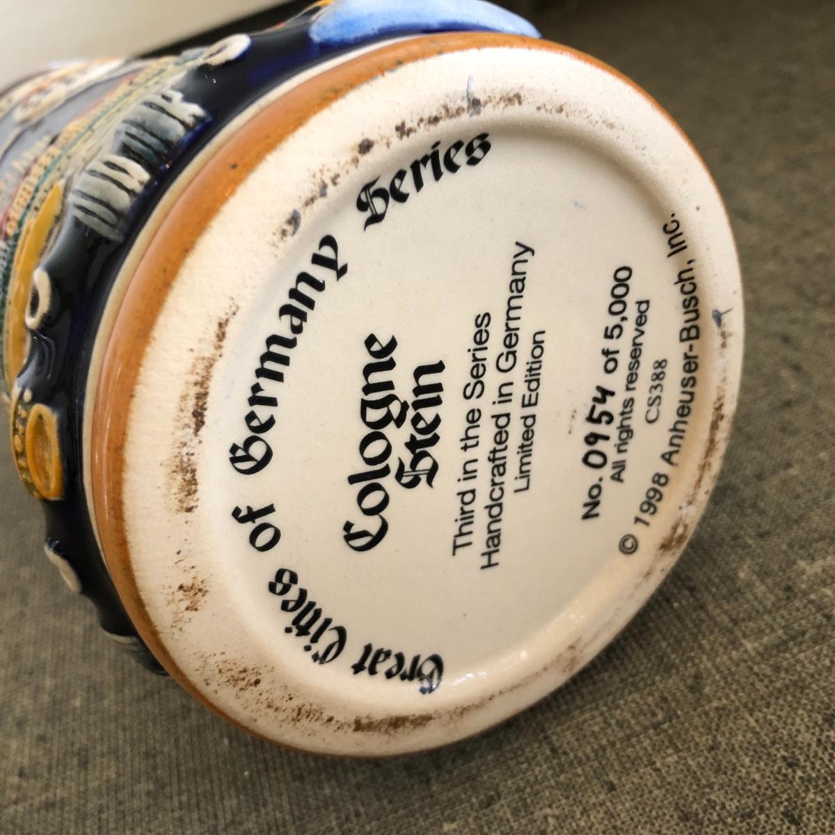 Lot includes ceramic Anheuser Busch Cologne Numbered stein and a ceramic Heidelberg Stein marked Beyer West Germany. Largest Stein measures 3.5”D x 10” tall.