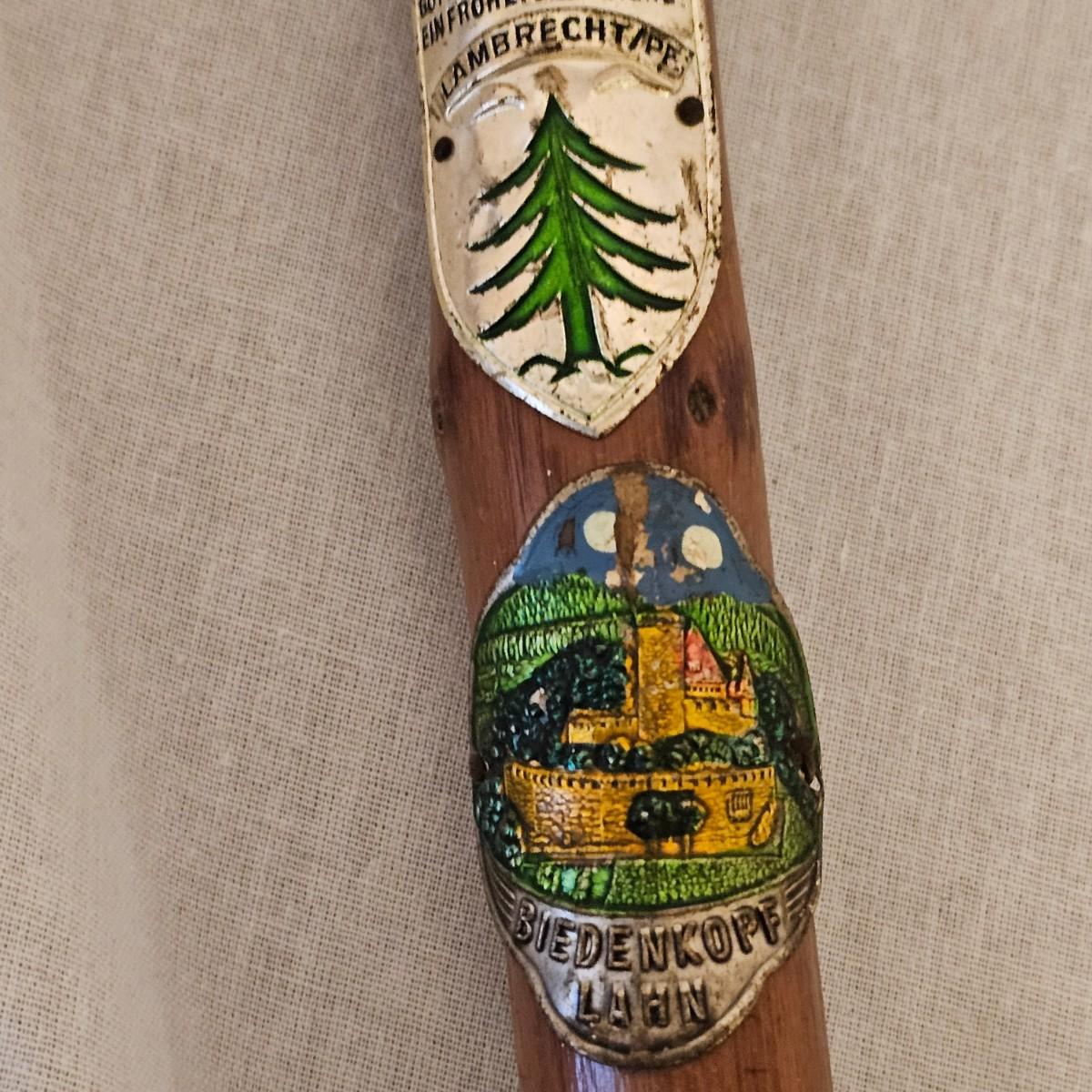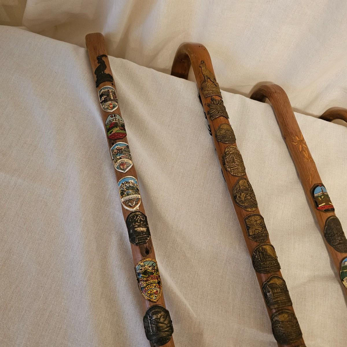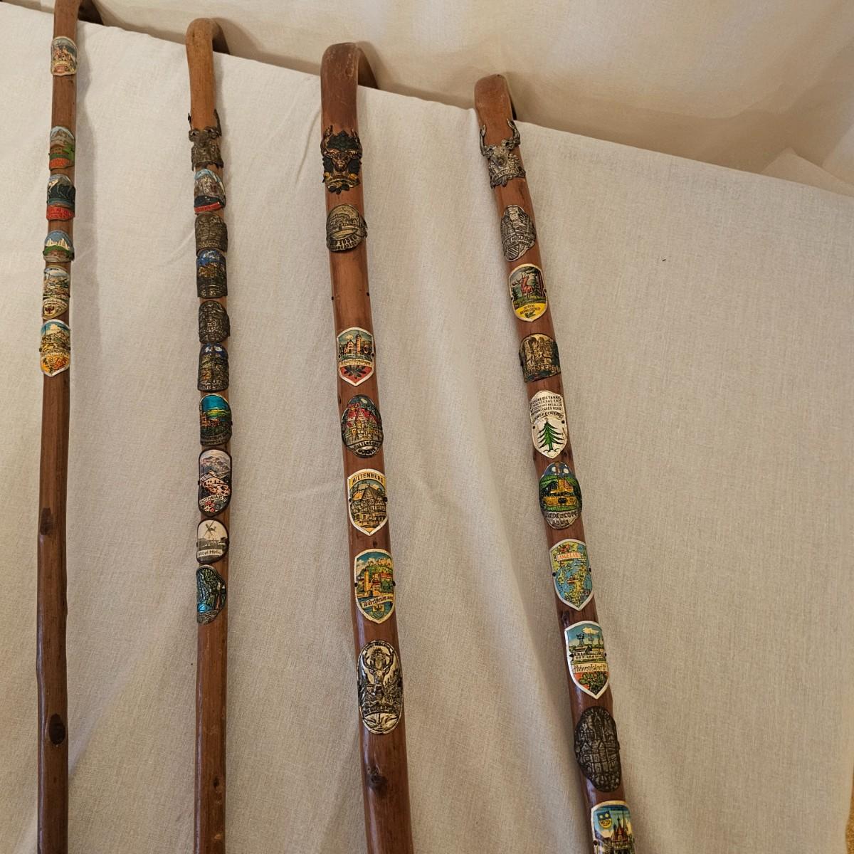 Seven distinctive vintage German hiking canes, adorned with numerous souvenir location tags for towns, mountains or landmarks. Know as 'Stocknagel' or stick nails, these badges and signets show where the traveler has ventured. There are over 50 of these pieces between all of the sticks. Canes average between 31" and 38" long. See photos for details. Local pickup only.