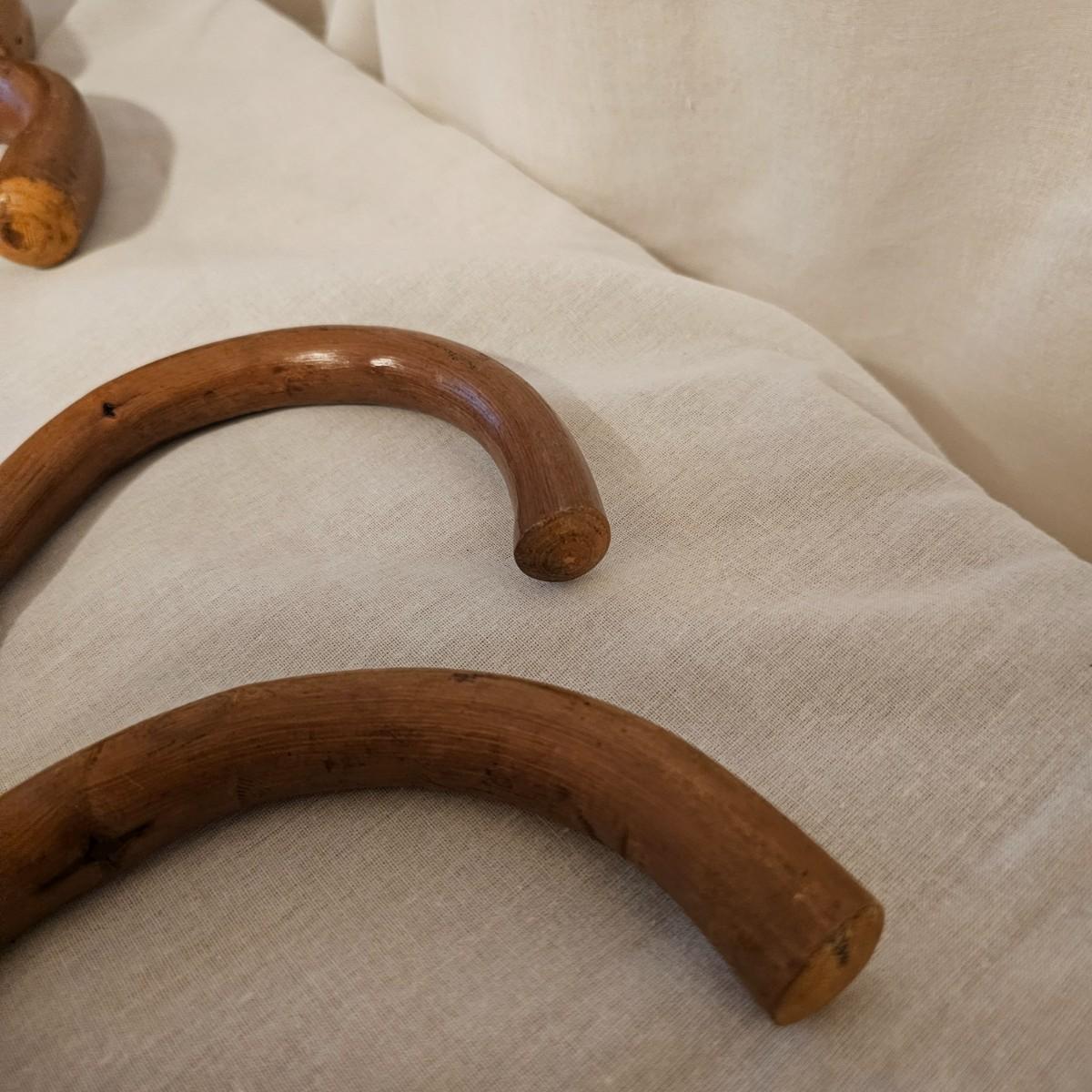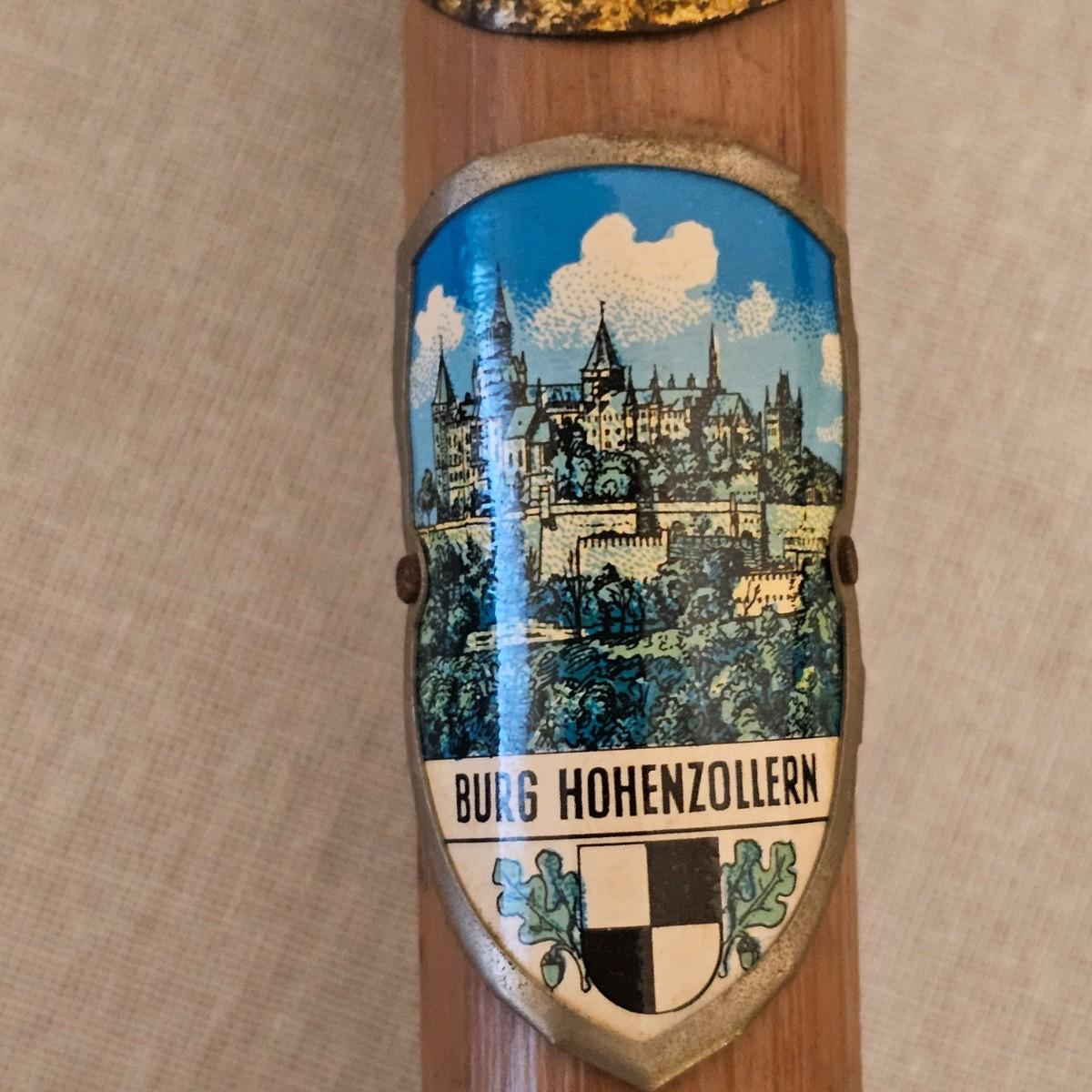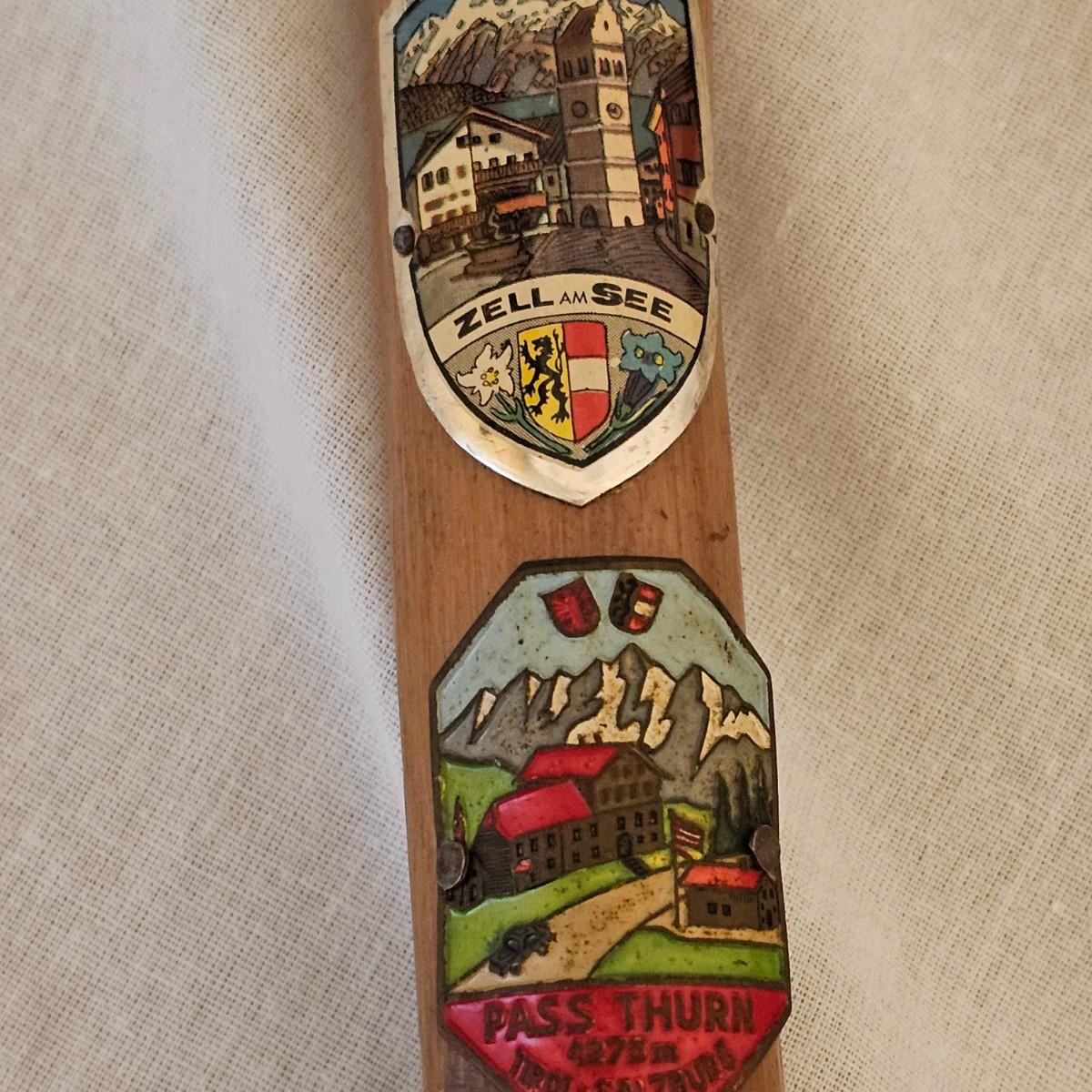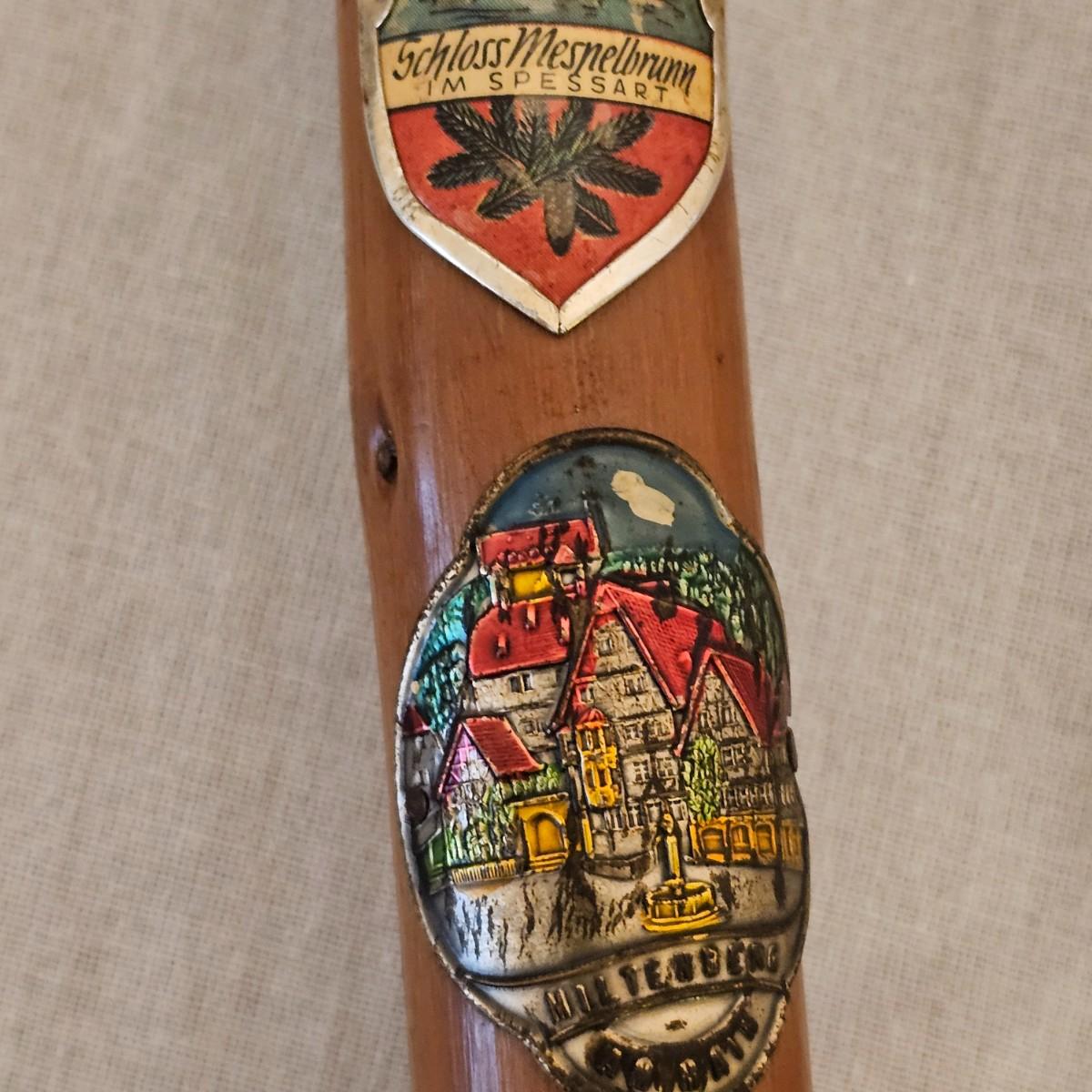 Seven distinctive vintage German hiking canes, adorned with numerous souvenir location tags for towns, mountains or landmarks. Know as 'Stocknagel' or stick nails, these badges and signets show where the traveler has ventured. There are over 50 of these pieces between all of the sticks. Canes average between 31" and 38" long. See photos for details. Local pickup only.