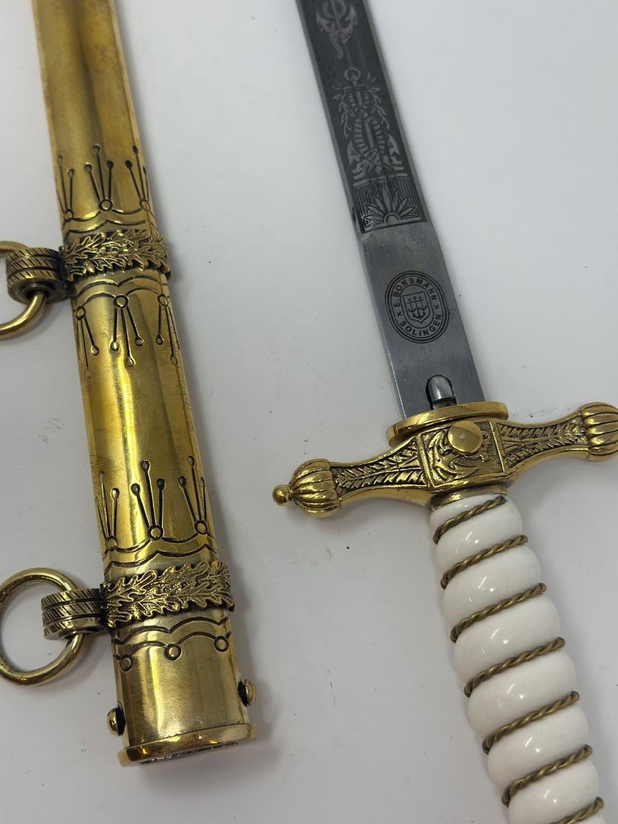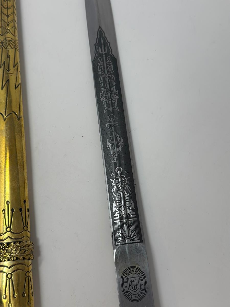 E. Bonsman Solingen WWII German Navy officer dagger with intricate engravings on the blade, scabbard and hilt. There are emblems such as an anchor, eagle and swastika on the hilt of the dagger.