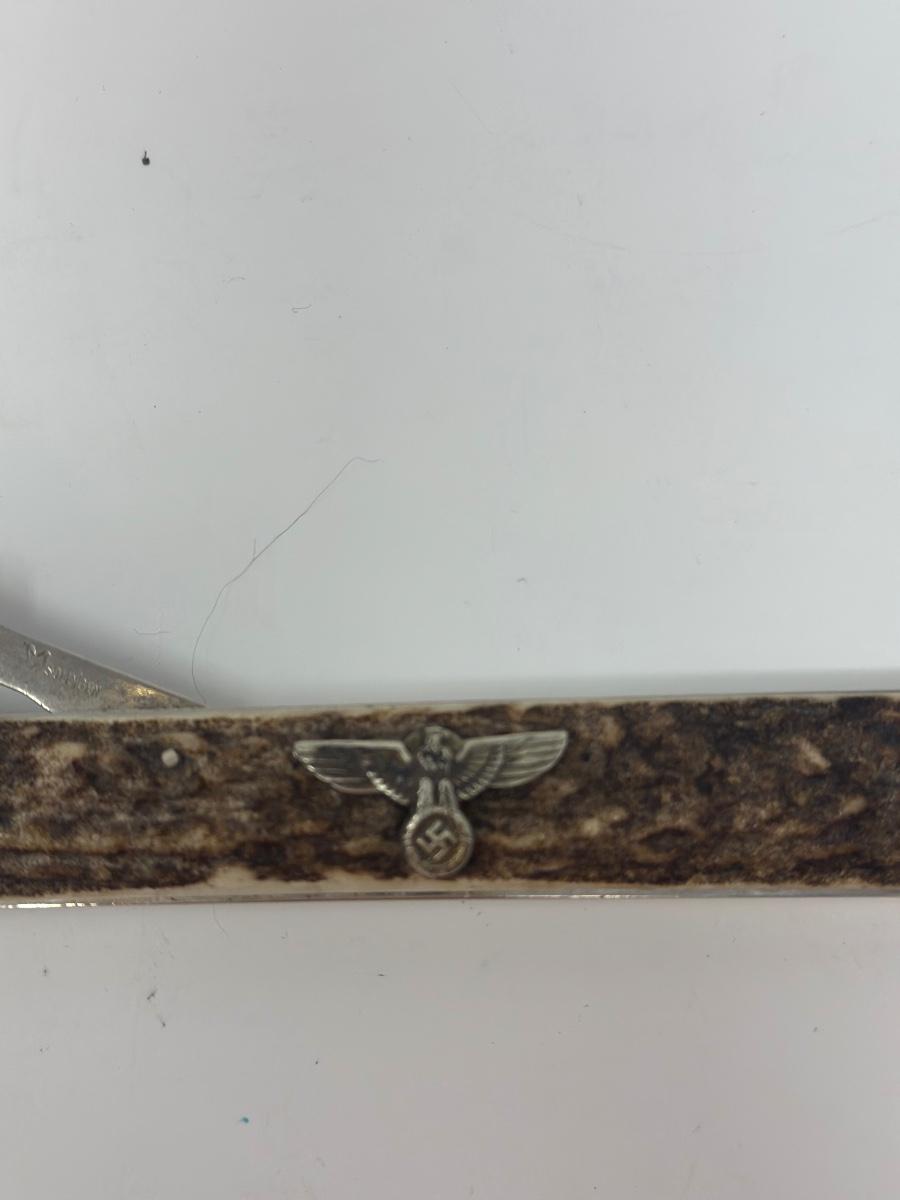 Stainless steel with imitation wood handle and Reichsadler with swastika overlay. NSDAP is a German abbreviation for the Nazi Party.