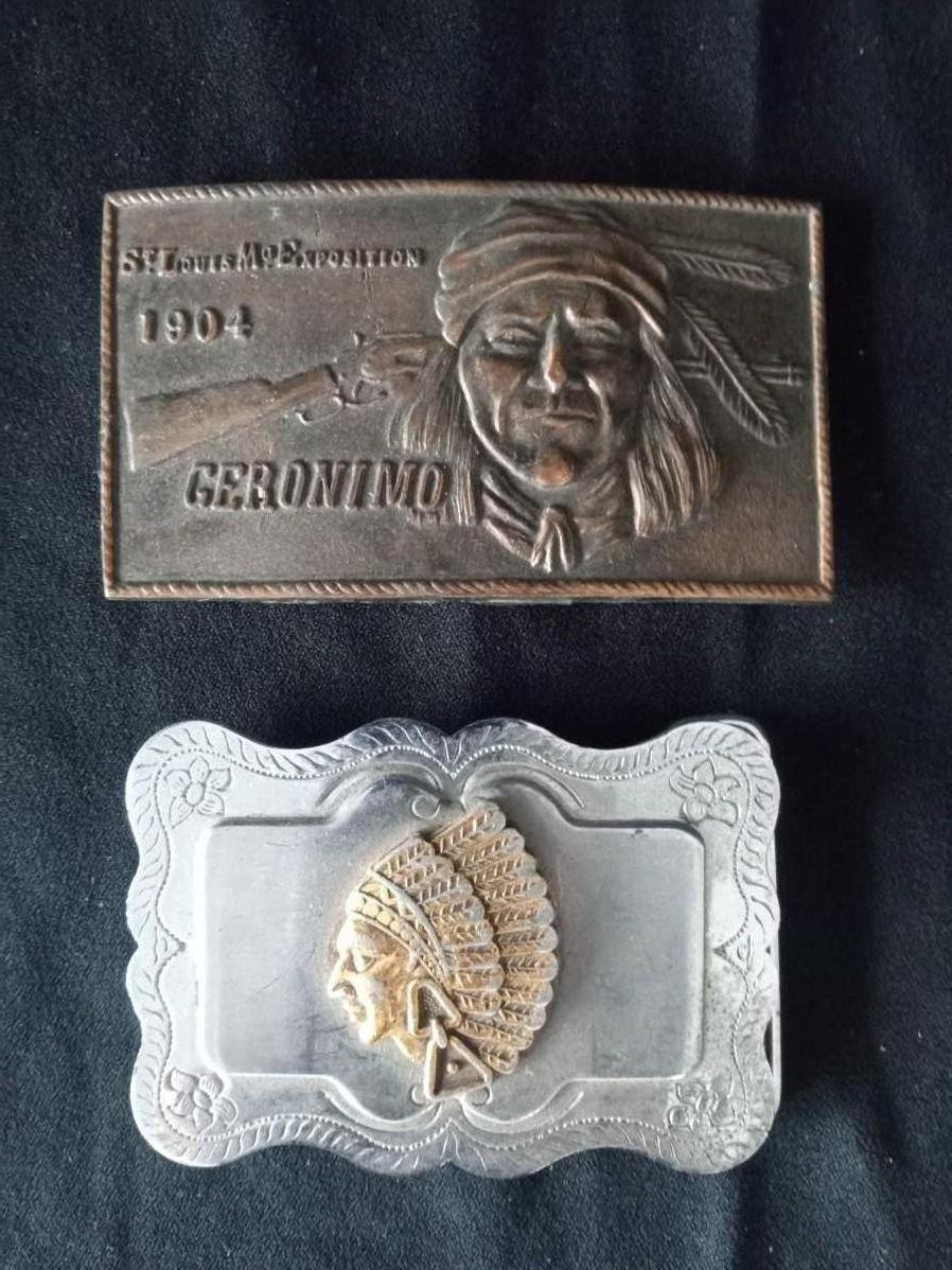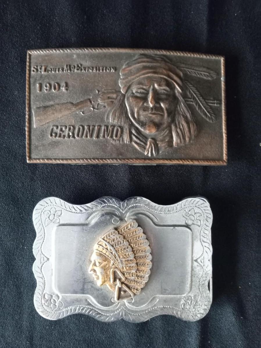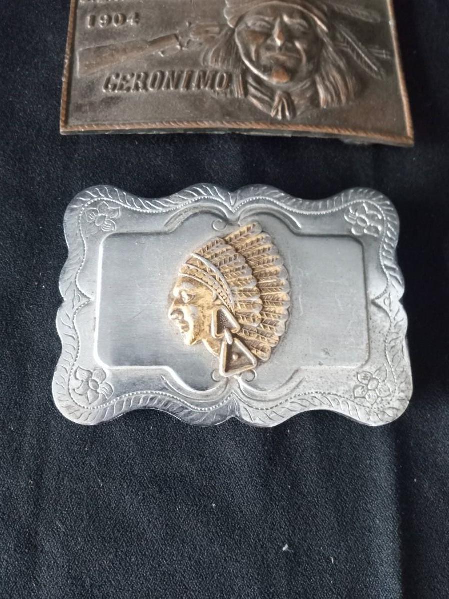 GERONIMO BRASS BELT BUCKLE AND INDIAN HEAD ON SILVER TONE BUCKLE
