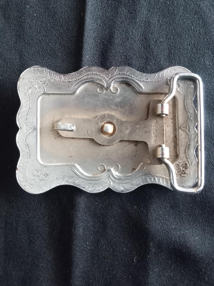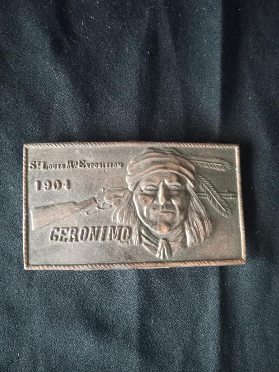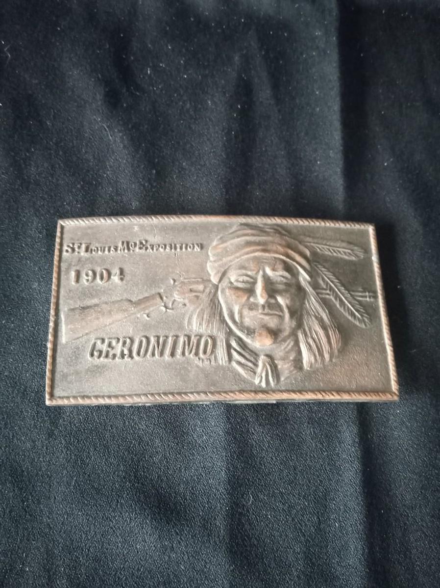 GERONIMO BRASS BELT BUCKLE AND INDIAN HEAD ON SILVER TONE BUCKLE