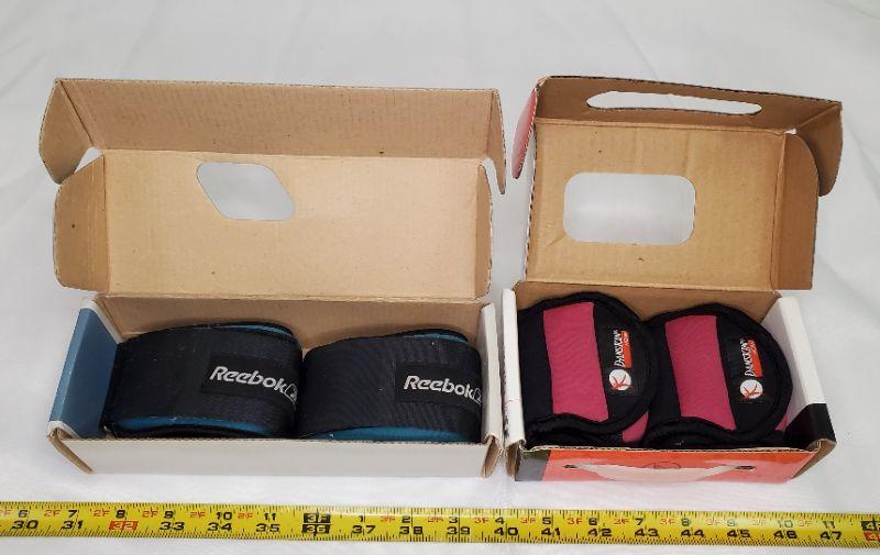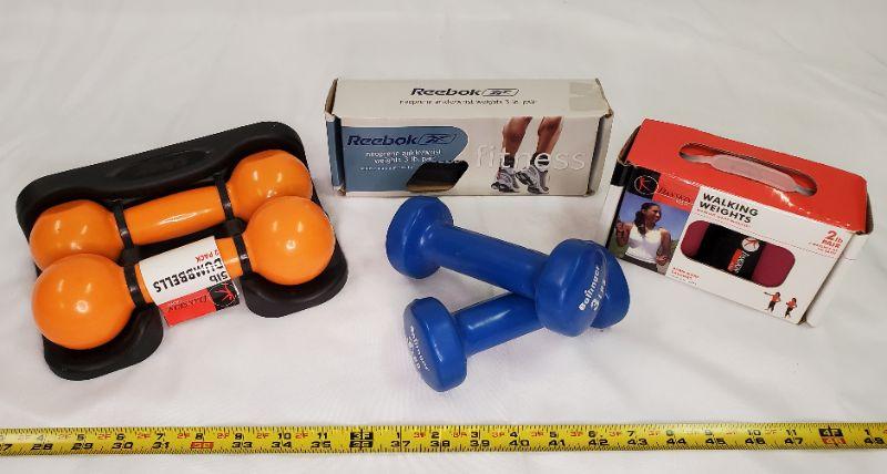 2 boxes of walking weights, they are in like new condition. 1 brand Reebok 3lb pair and the other Danskin 2lb pair. Danskin 5lb dumbbells, 2 pack new in package. Bollinger 3lbs, used still in good condition.