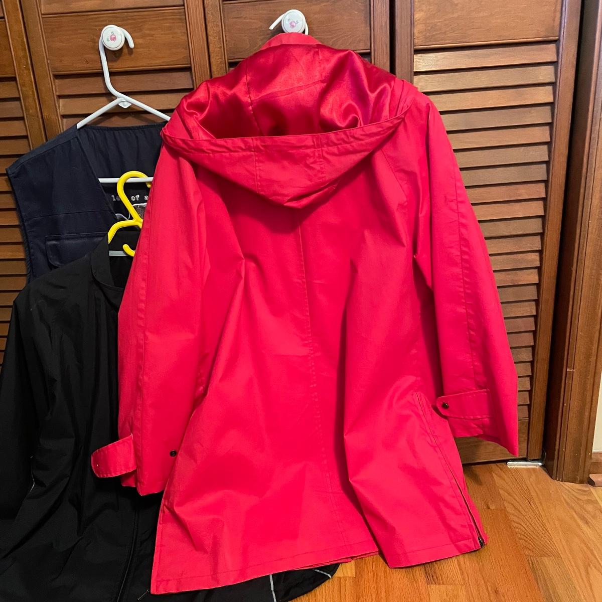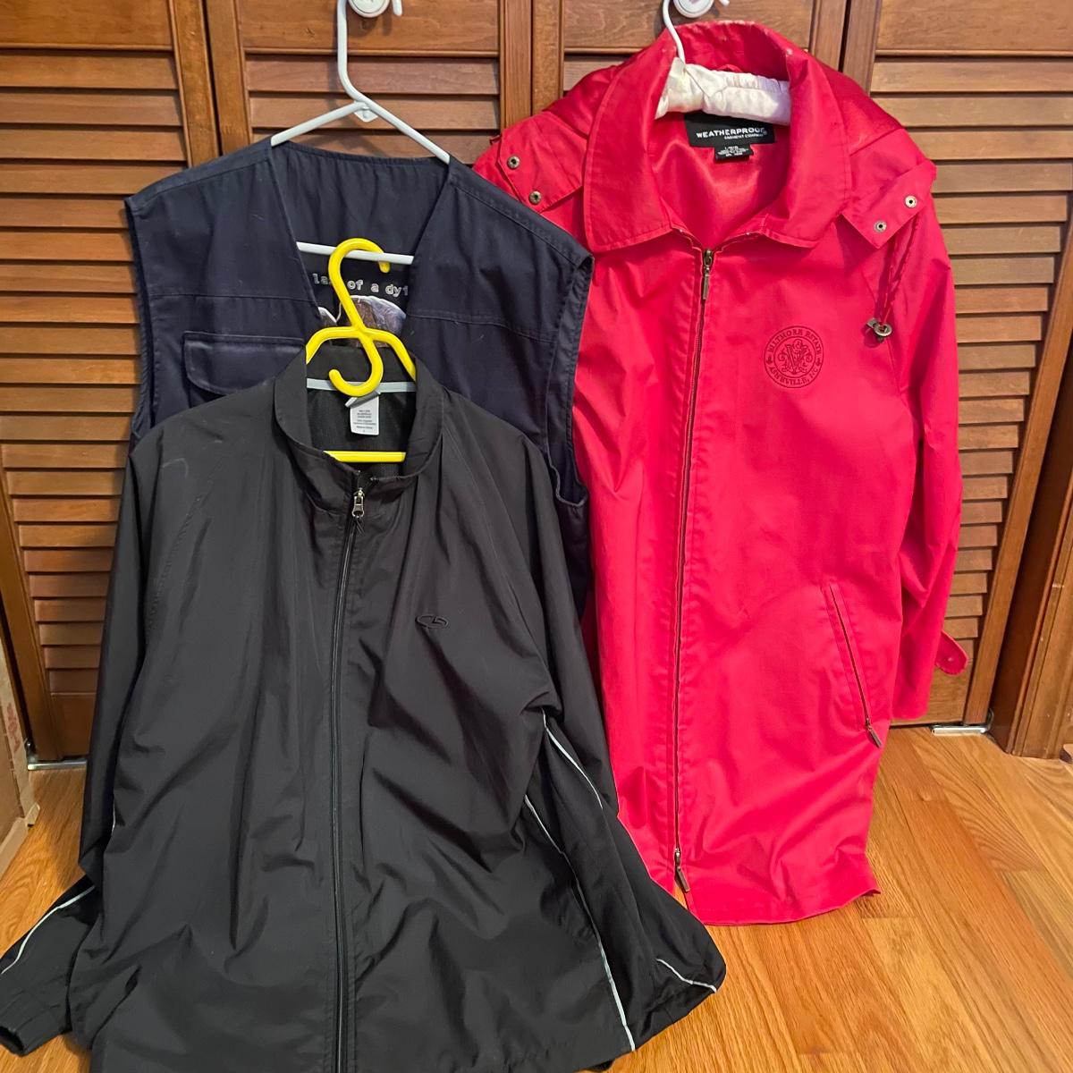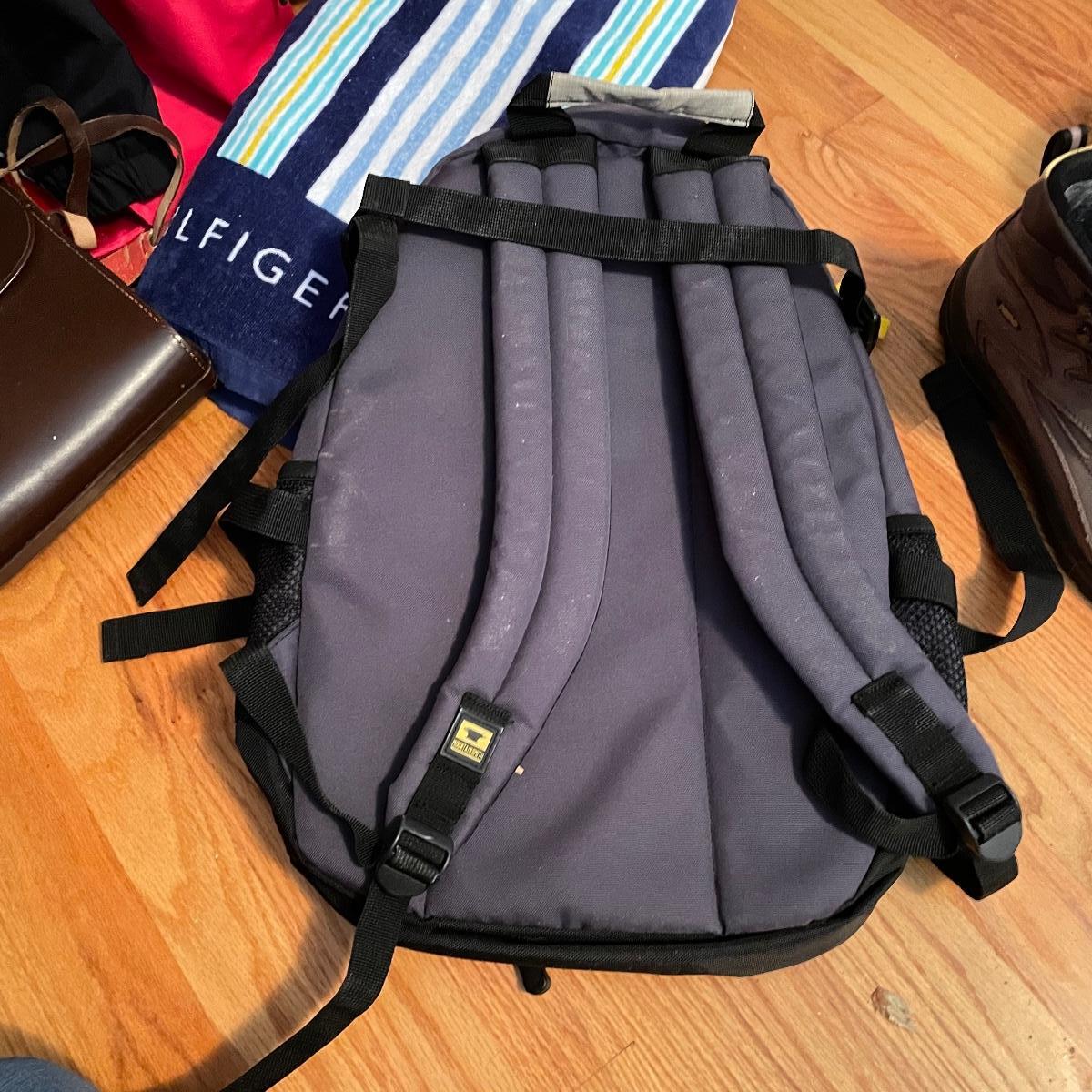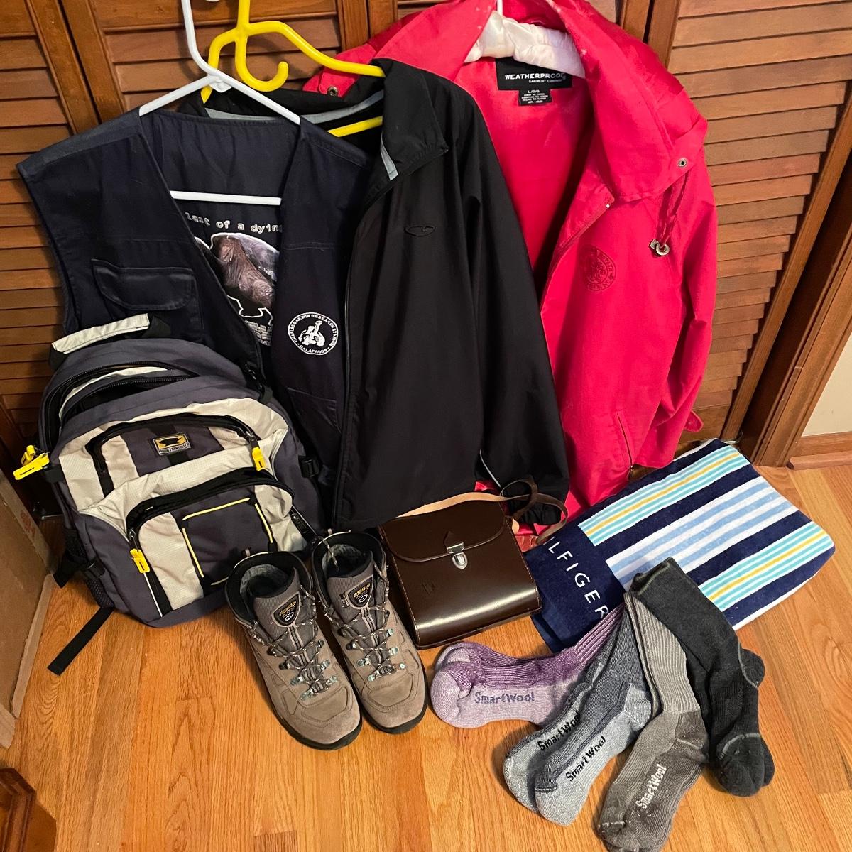 This lot includes Ladies Asolo hiking books, size 10, two weather resistant size large coats, a red Biltmore rain coat and a thin Champion windbreaker. Lot also includes three pairs of Smart Wool socks and another pair of wool socks, a Galapagos Island utility vest and hat with a MountainSmith backpack. Lastly, a 40” x 70” Hilfiger beach towel and a pair of Steinhein binoculars with case. The strap on the binoculars appears to be close to dry rotting and the collar on the red coat has been a bit worn. See images. Local pick up only.