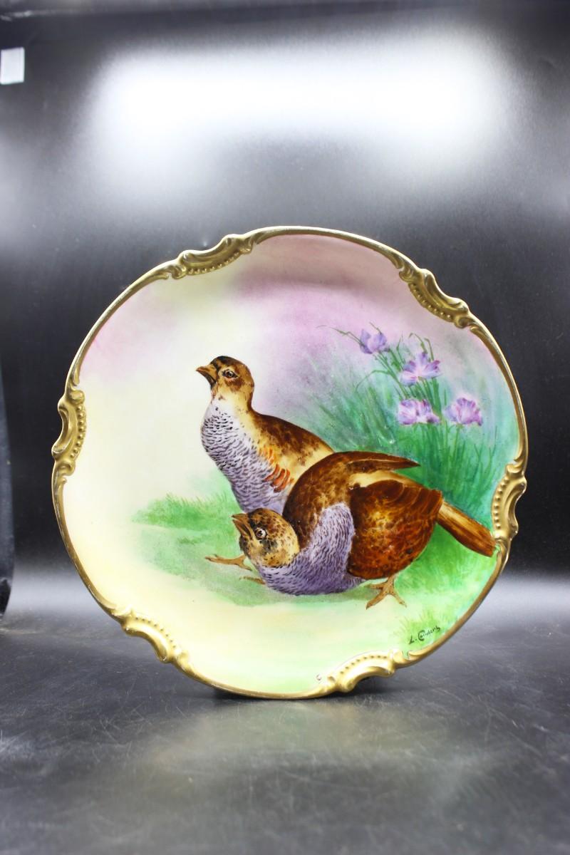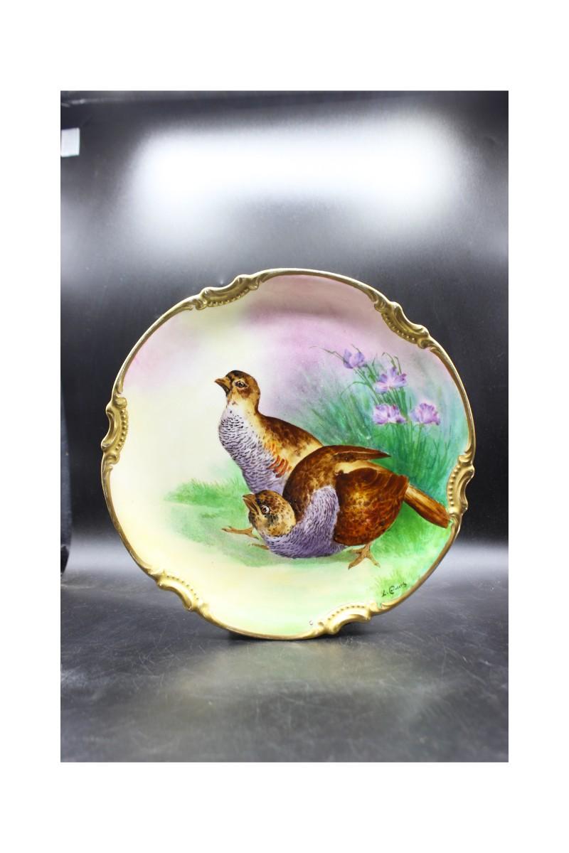 Vintage Limoges France hand painted plate. Features a couple of grouse birds and flowers. Looks to be artist signed. Good condition.