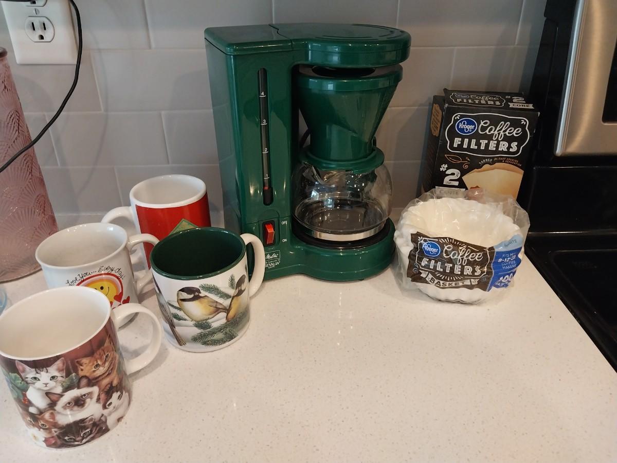 GEVALIA COFFEE MAKER AND COFFEE CUPS W/FILTERS