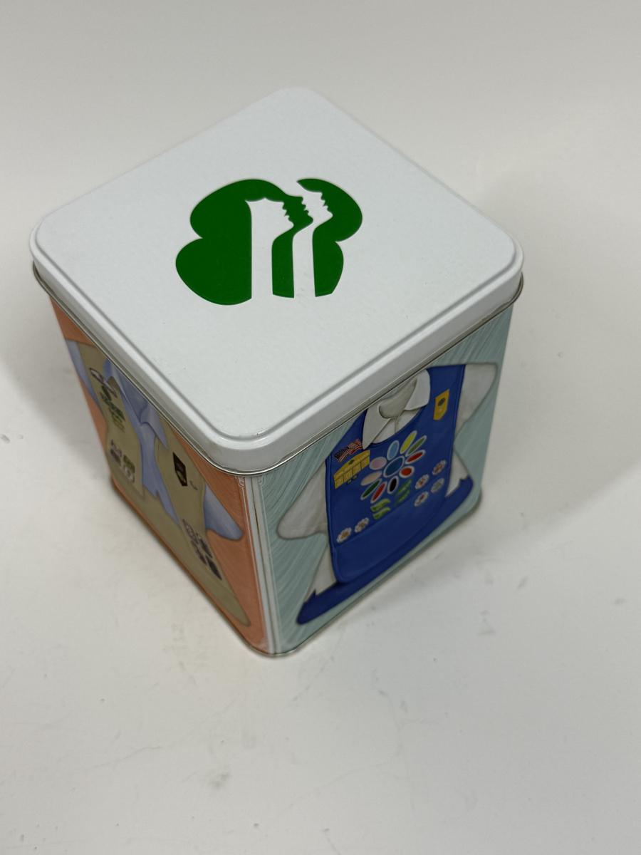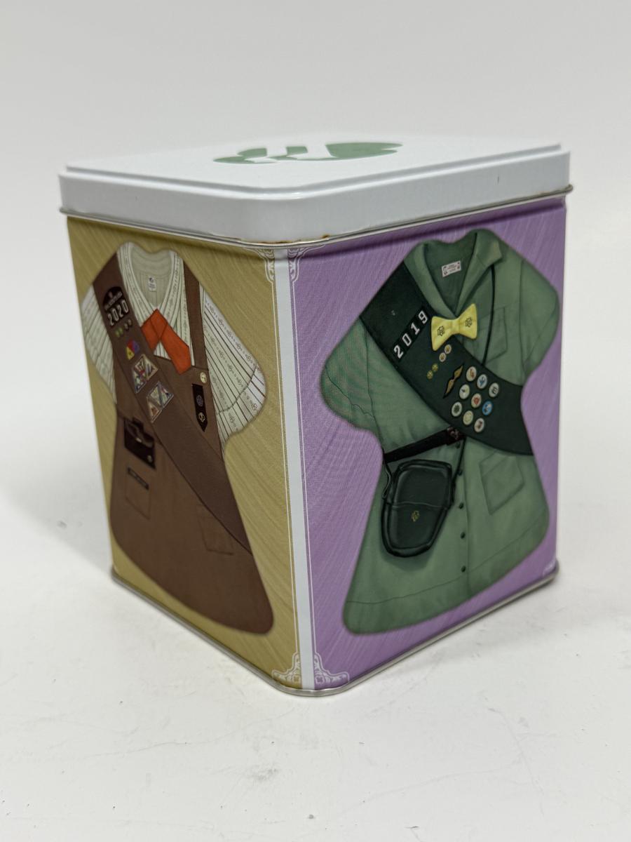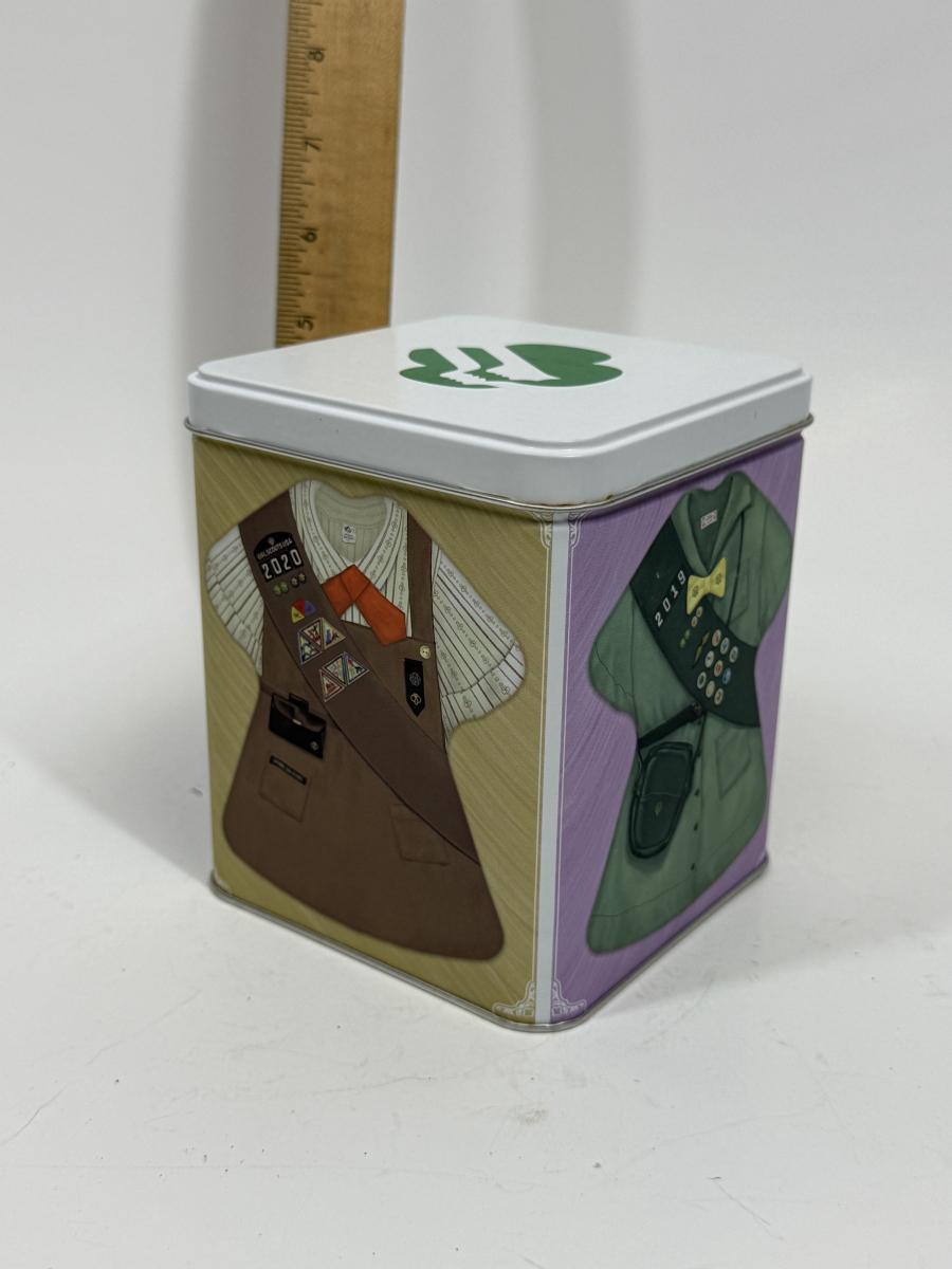 Collectible Metal Tin with snap-down lid. Images of 4 different Girl Scout uniforms. No dents or scratches.
