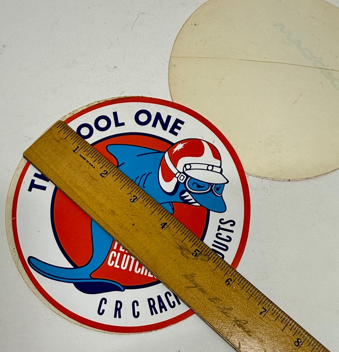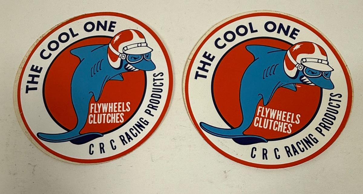 Images of a shark with a racing helmet. Advertises CRC Racing Products Flywheels and Clutches. Good condition, approx. 6" across.