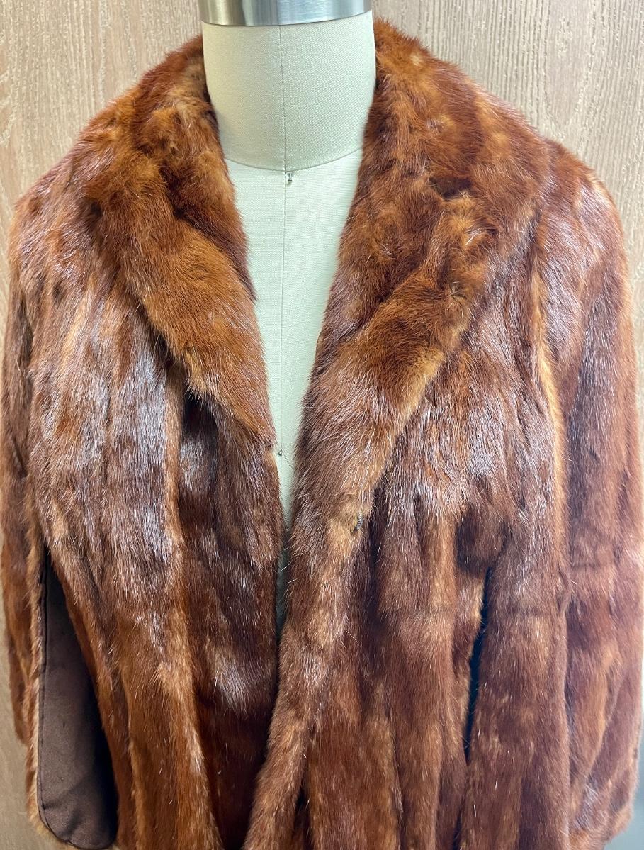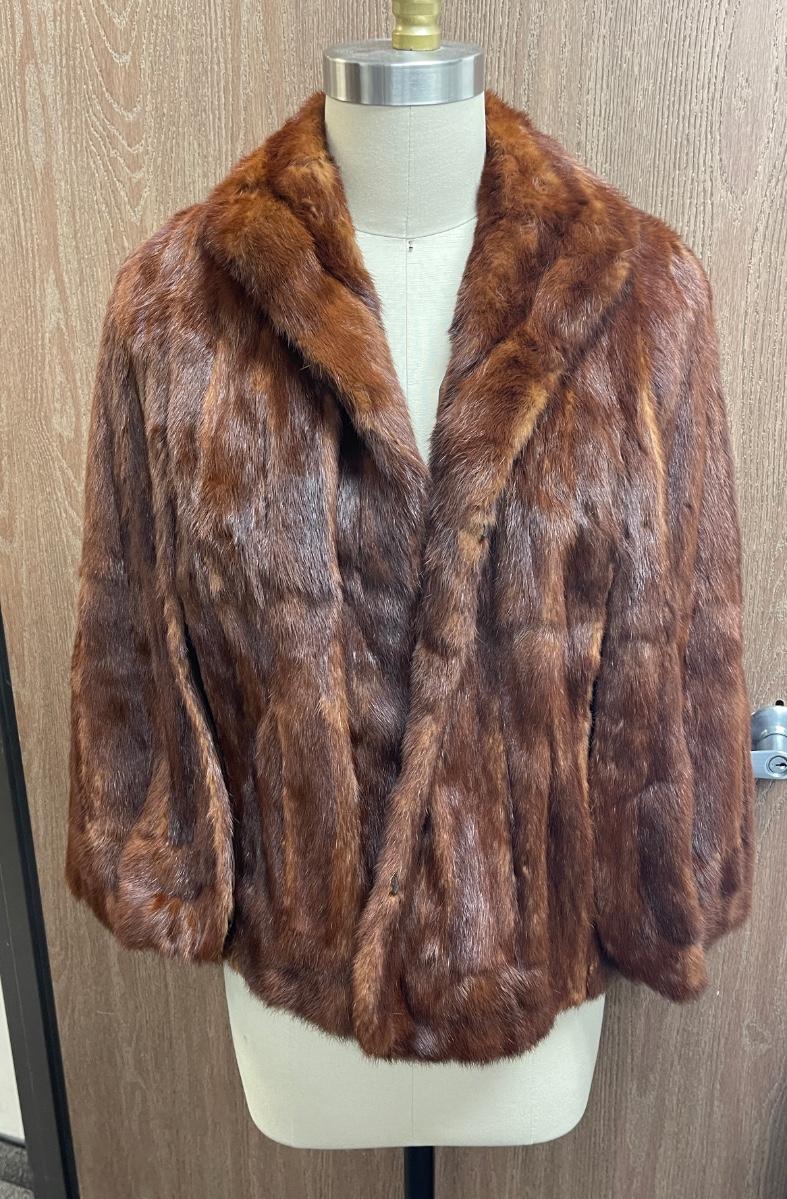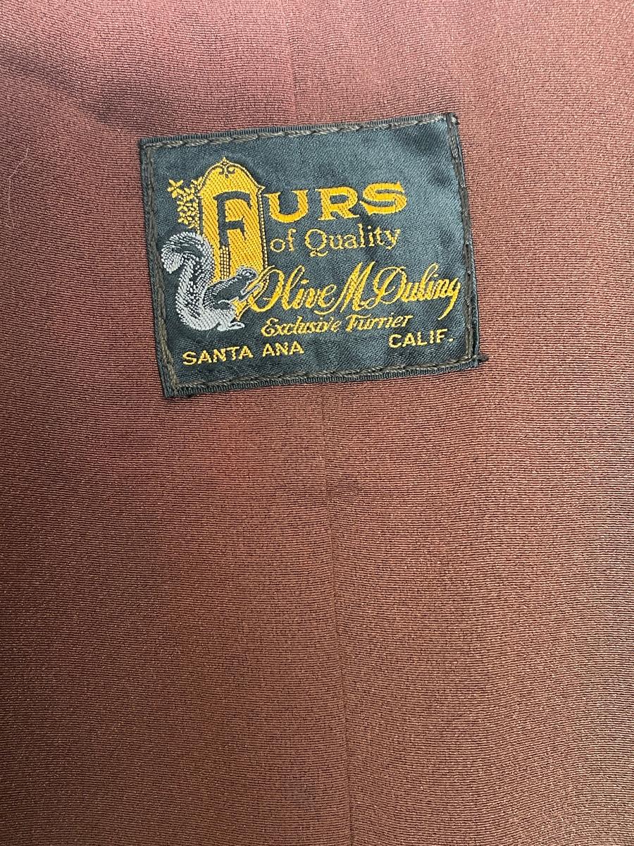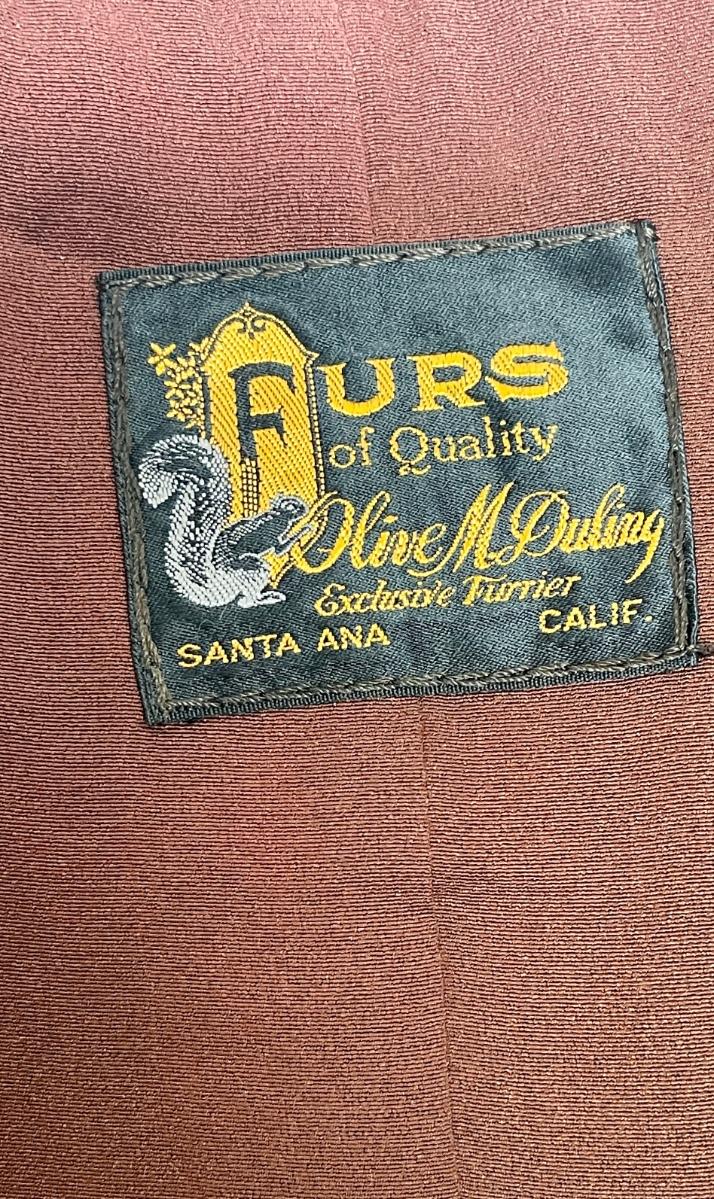 We think it's Mink, but we are not completely sure. It has arm slits. Made by Olive M Duling exclusive furrier in Santa Ana,CA. Old and stored inside bag in closet for at least 20 years, but in fair condition. Our mannequin is a size 8, so we are guessing a size 10.