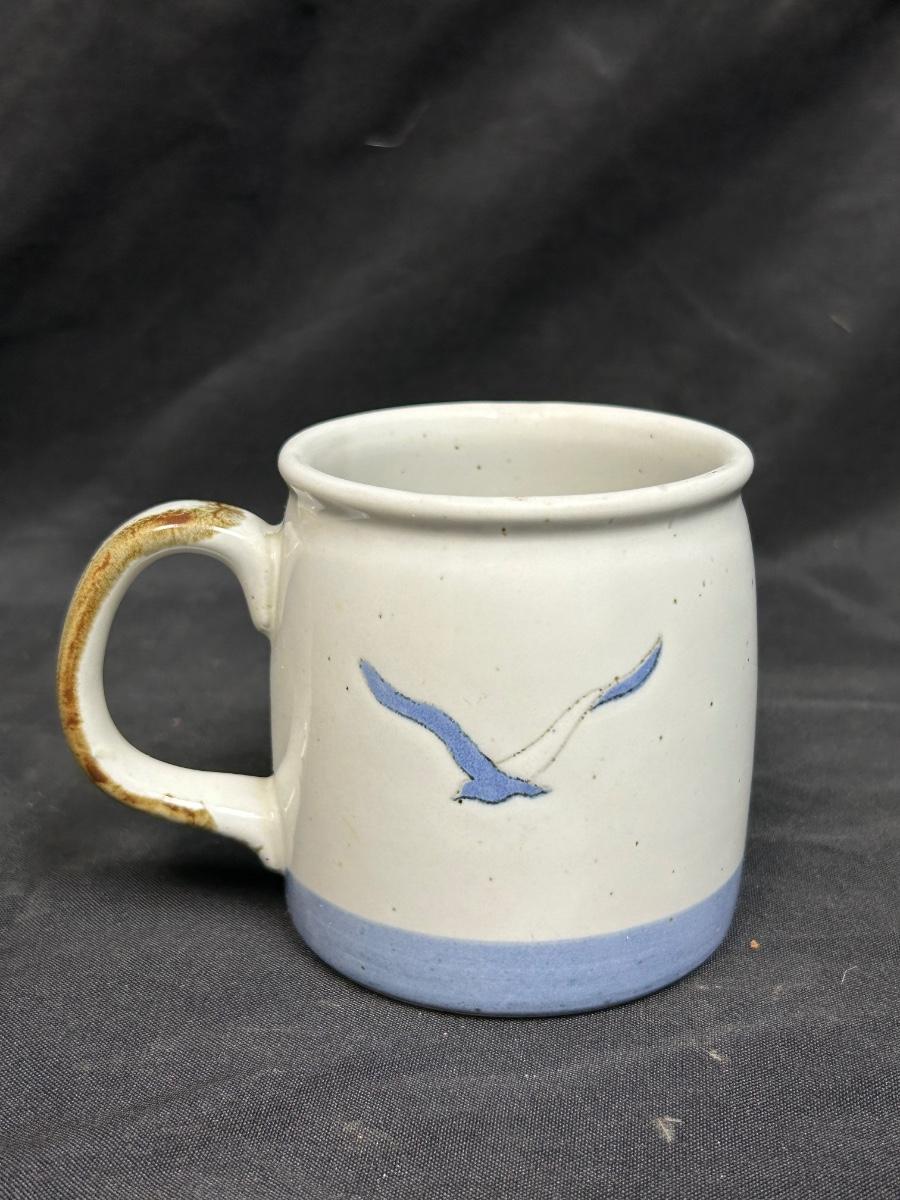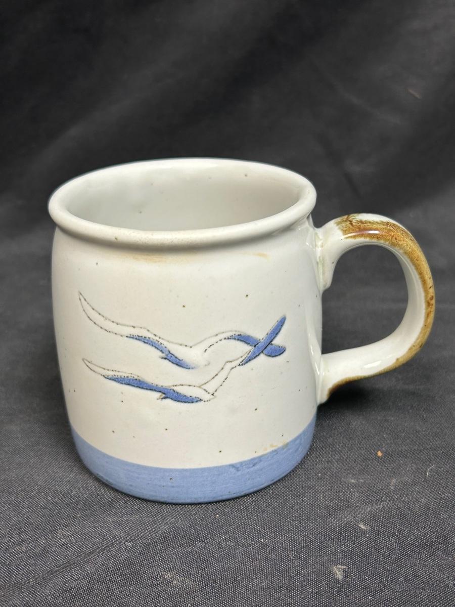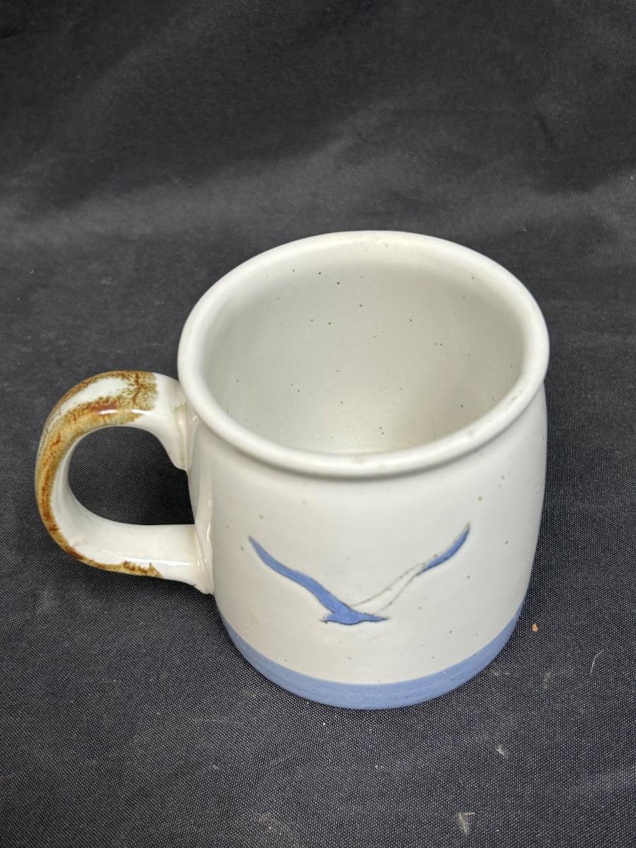 Retro White and Blue Stoneware Pottery Seagull Birds Flying Coffee Cup Mug. In fair condition. Would display well, there is cracking inside on the bottom, but it does not go all the way through.