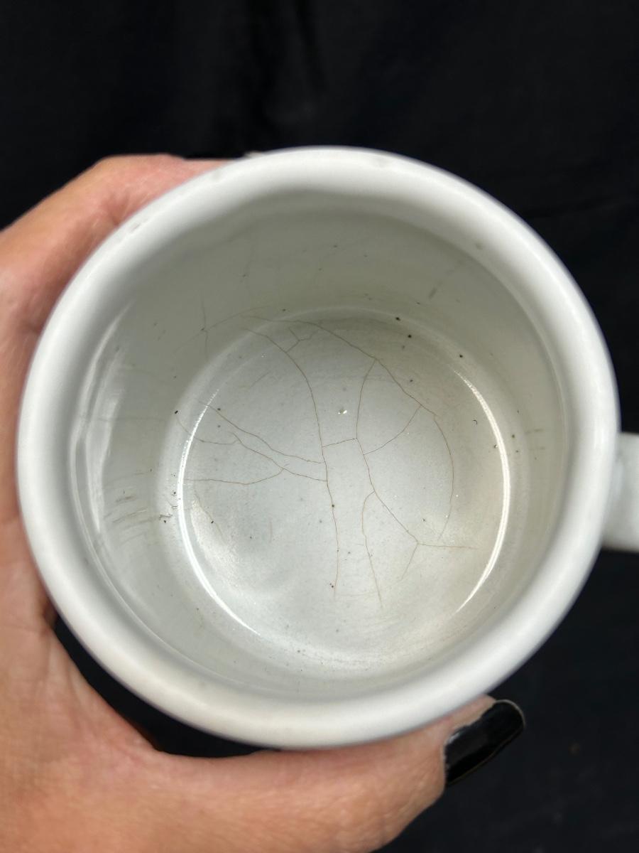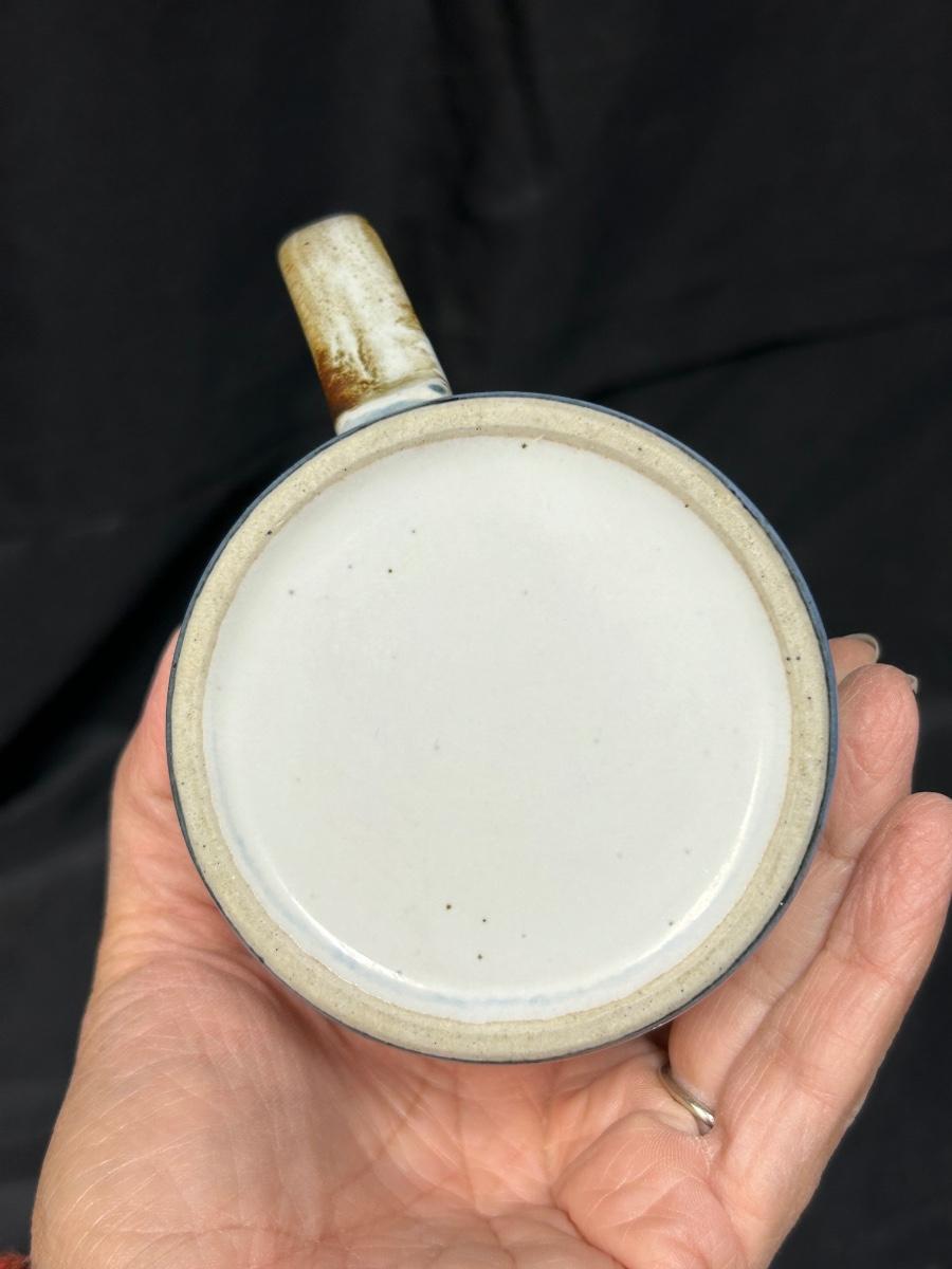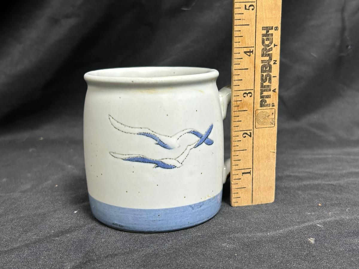 Retro White and Blue Stoneware Pottery Seagull Birds Flying Coffee Cup Mug. In fair condition. Would display well, there is cracking inside on the bottom, but it does not go all the way through.