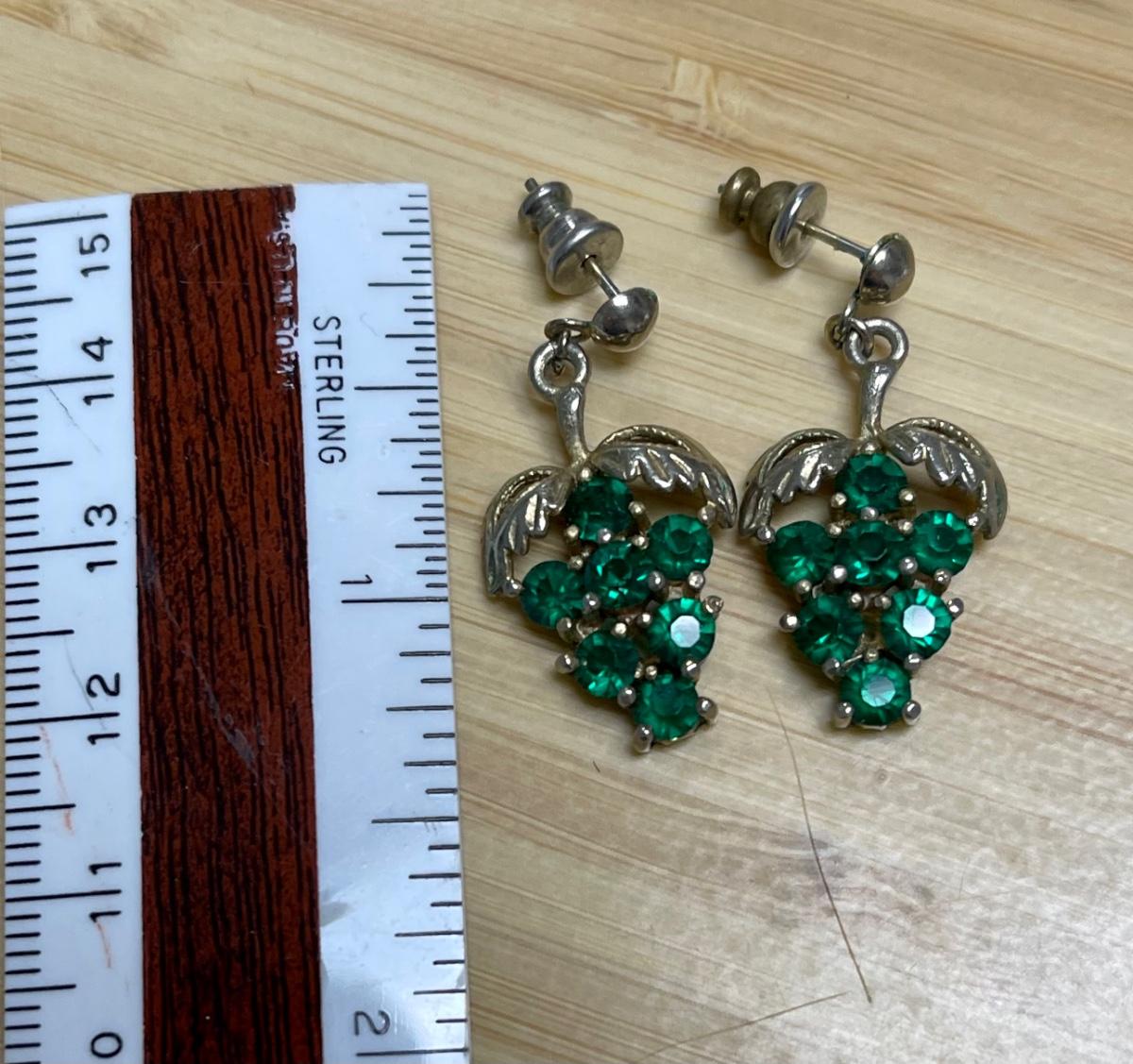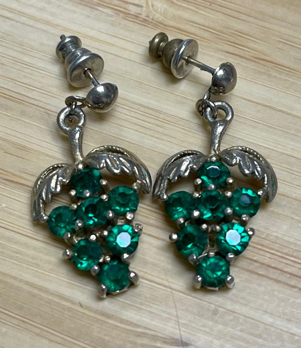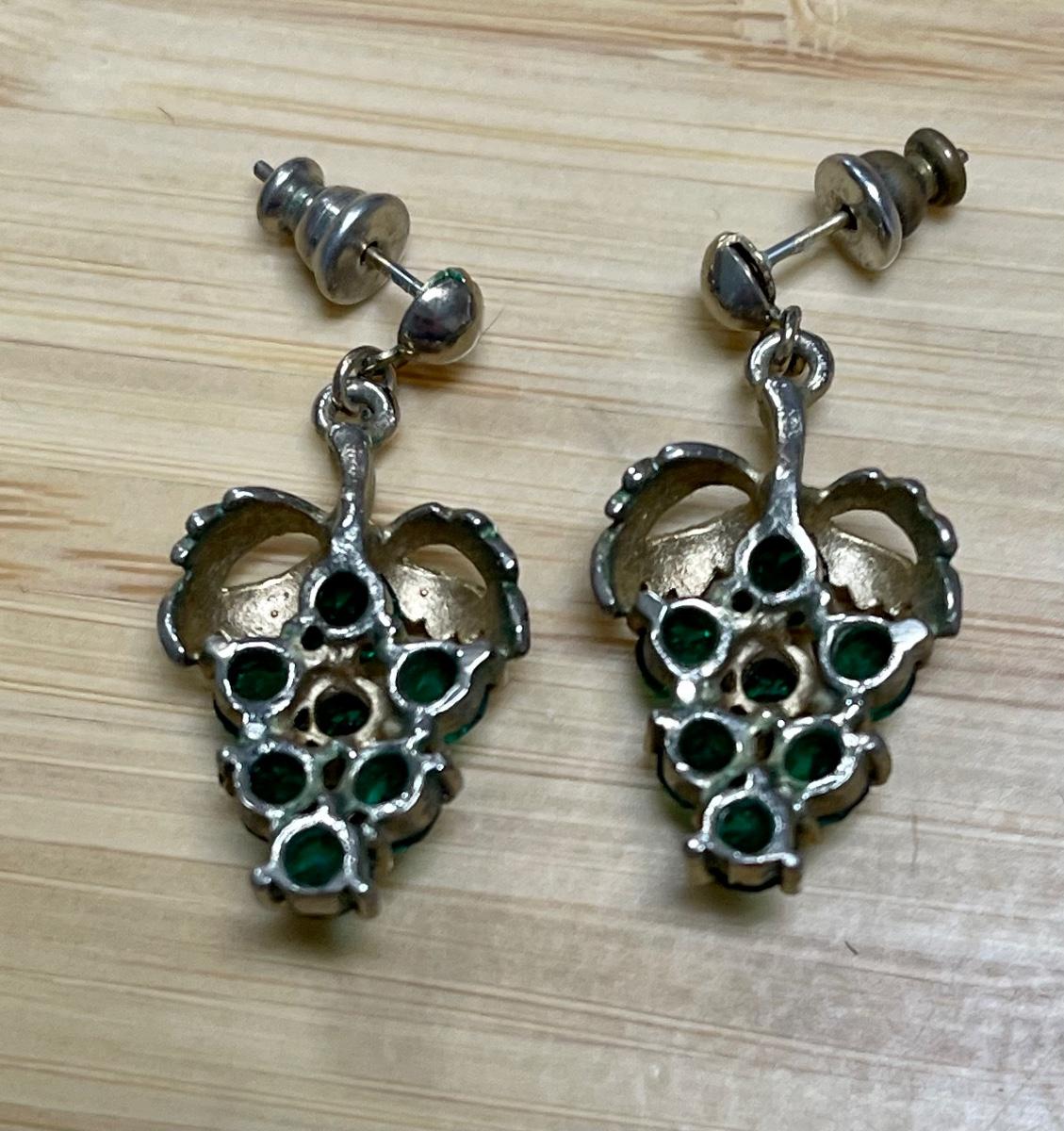 Pair of Green Rhinestone Grape Bunch Dangle Drop Earrings. Good condition.