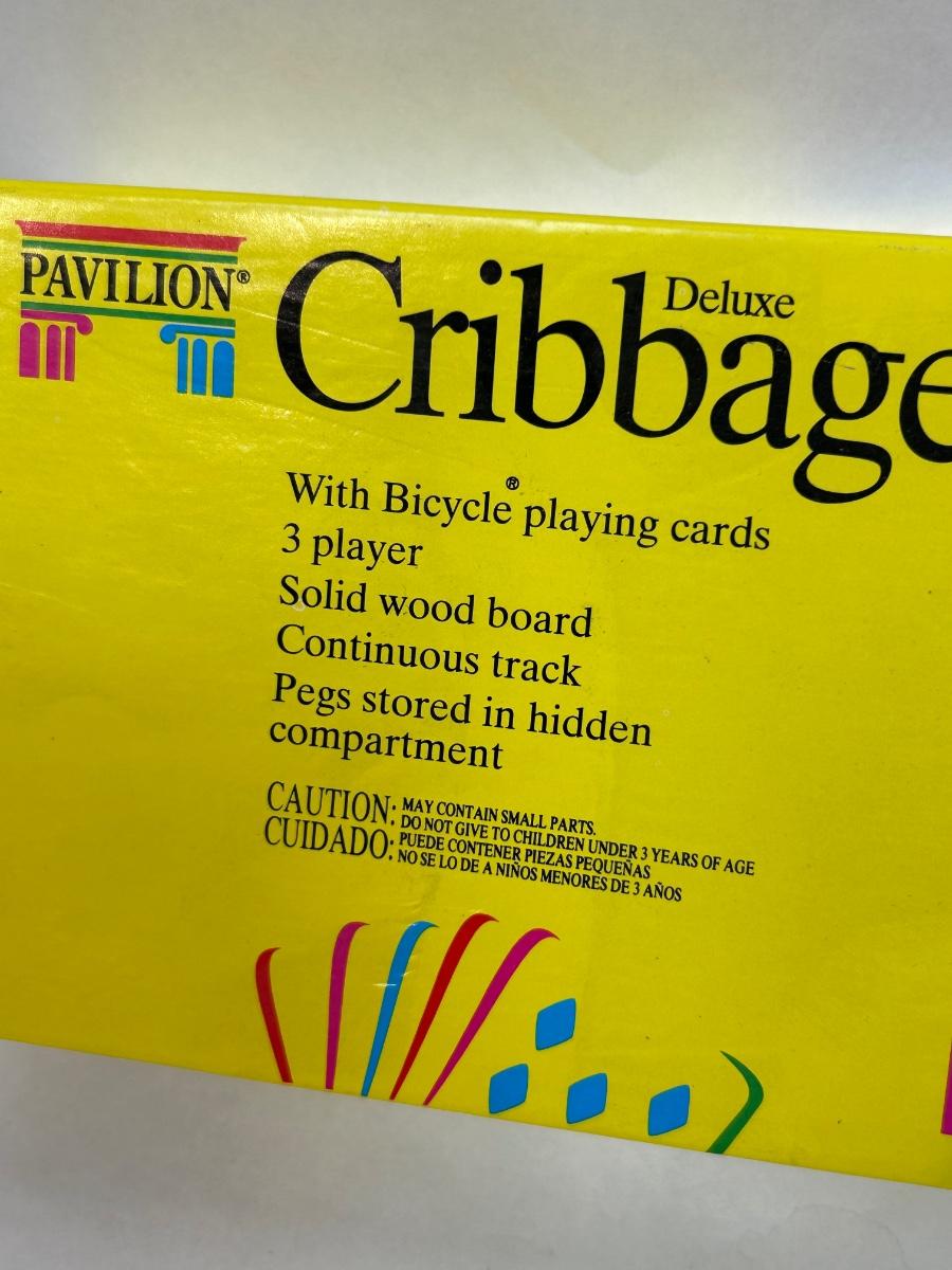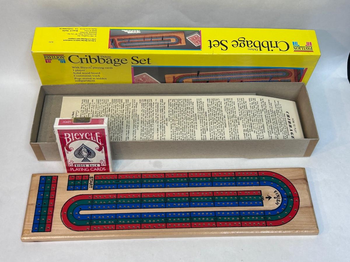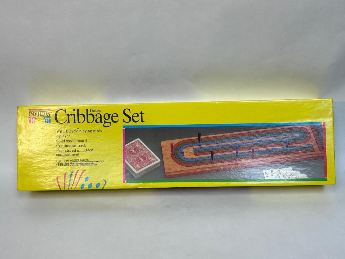 Pavilion Deluxe Cribbage Set New in Box Sealed Playing Cards. Looks to be unused, just opened box.