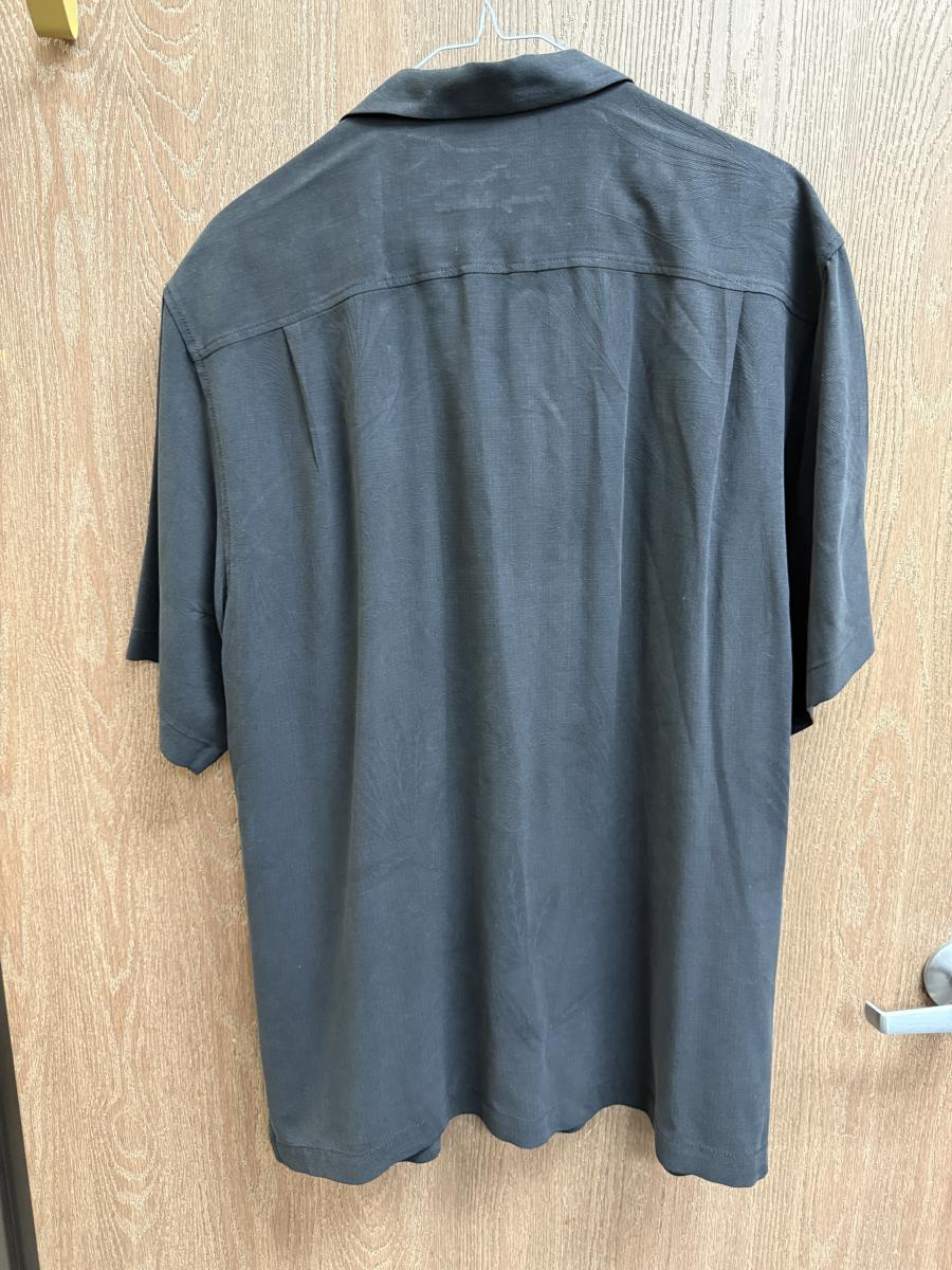 Black short-sleeve button-down shirt, left chest pocket. Good used condition.