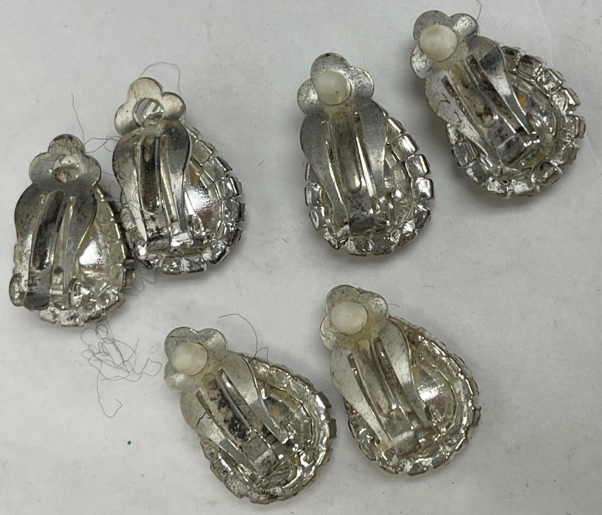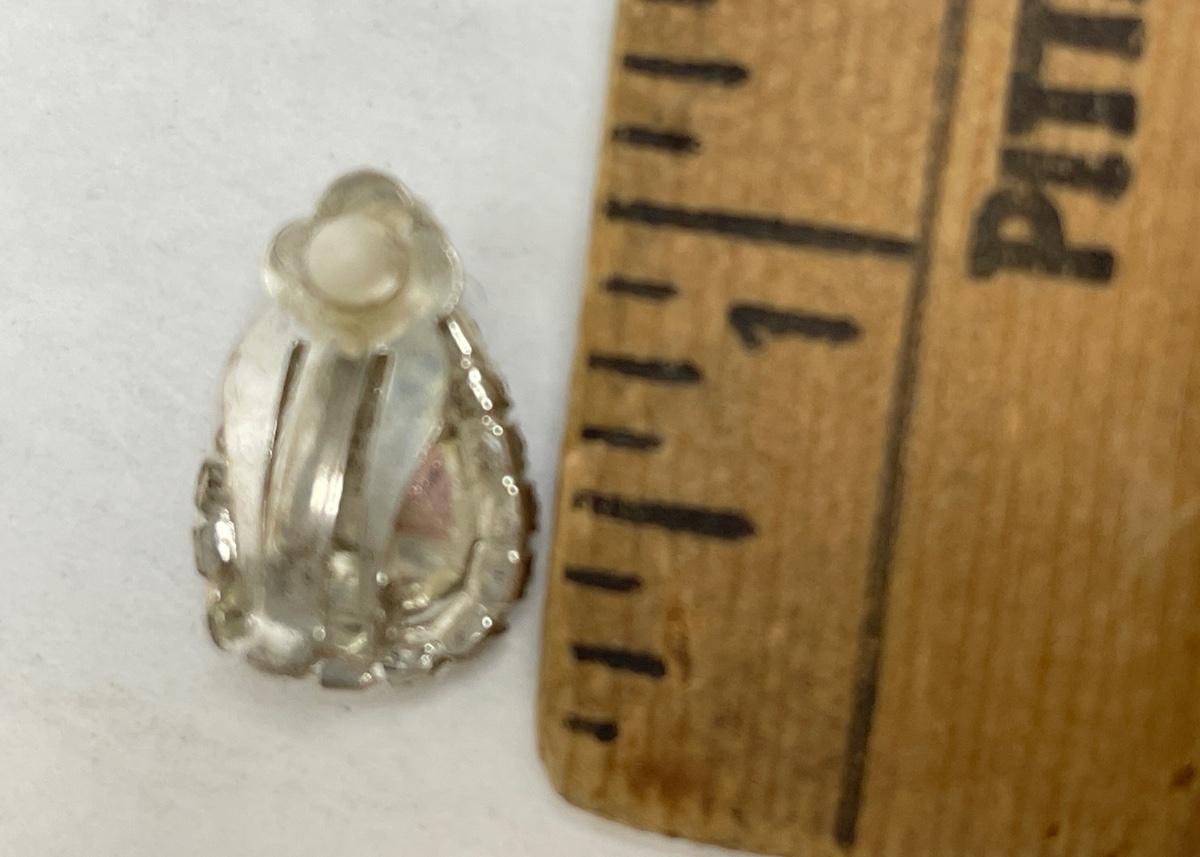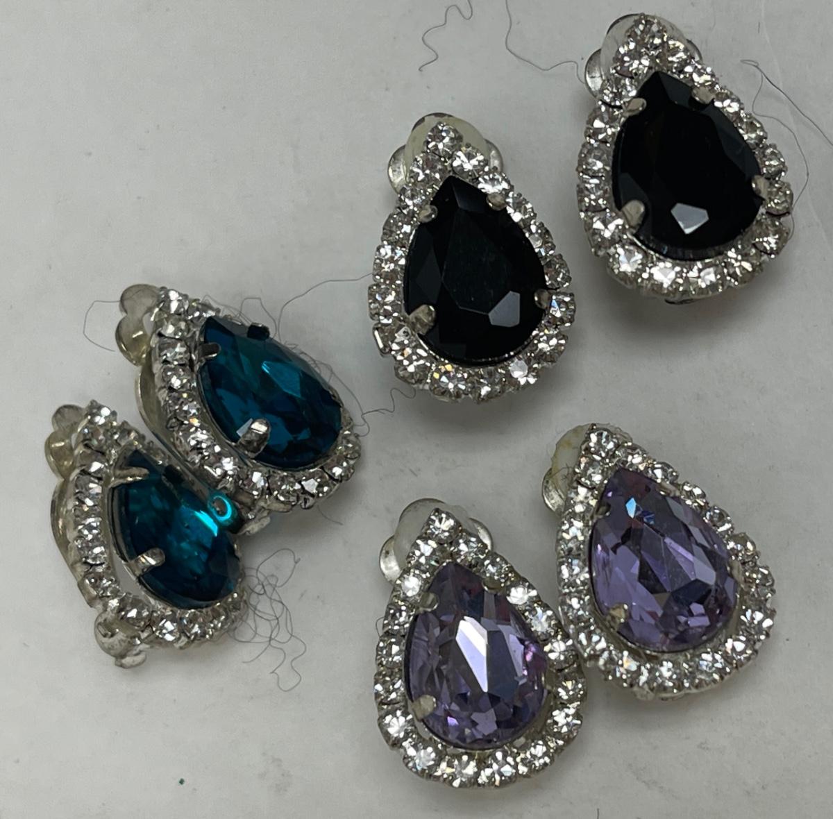 3 colors: dark red, turquoise blue, and amethyst purple. Each is surrounded by small rhinestones, Approx. 7/8" long.