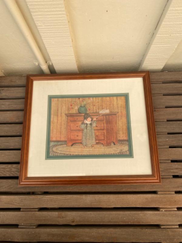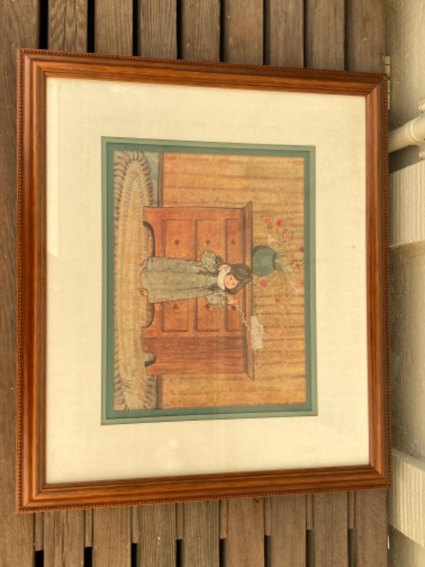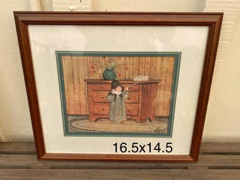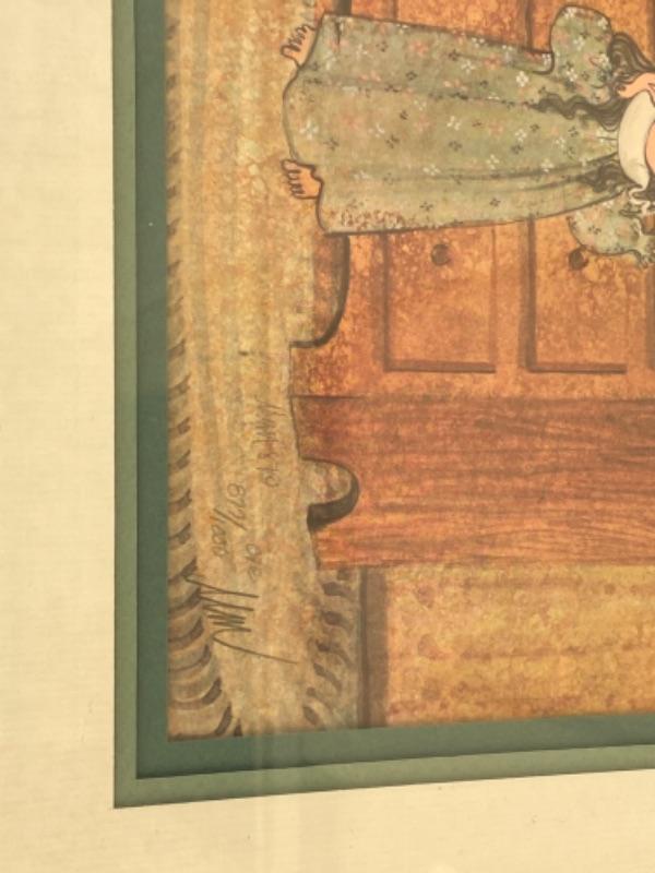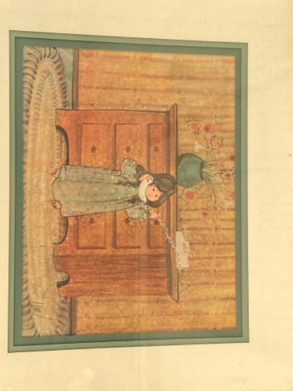 1987 Limited Edition P Buckley Moss print, framed, Girl on phone with dresser, EDITION #877/1000, 16" X 14"