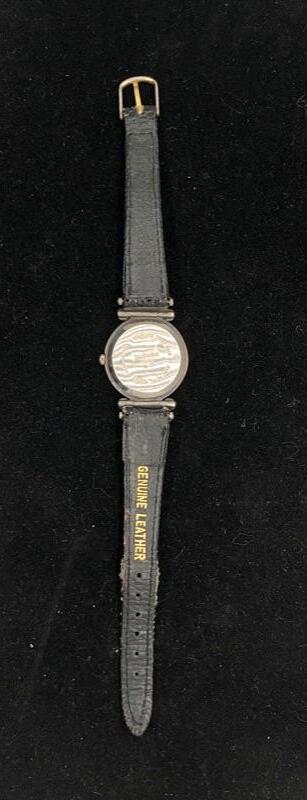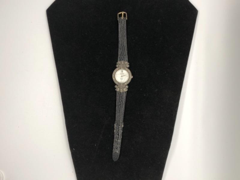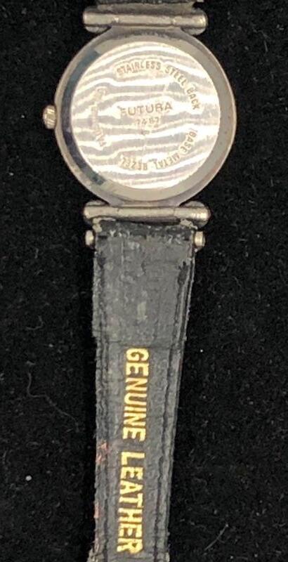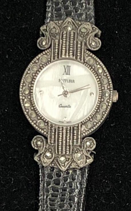 Woman's Futura watch. Marcasite watch face with a black leather band. Band has some wear along the size adjustment holes. 8" length. Currently not running.