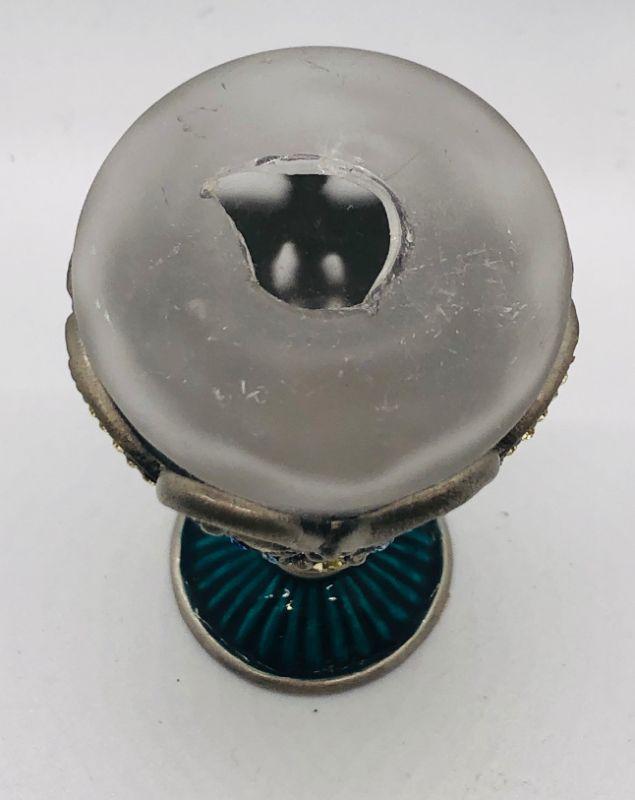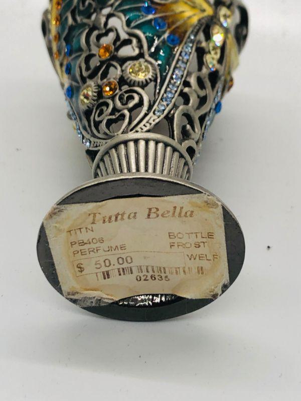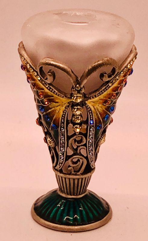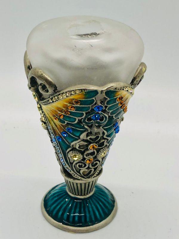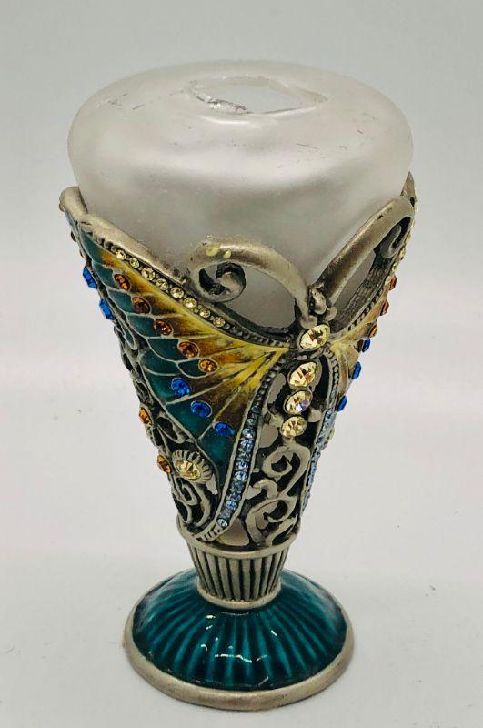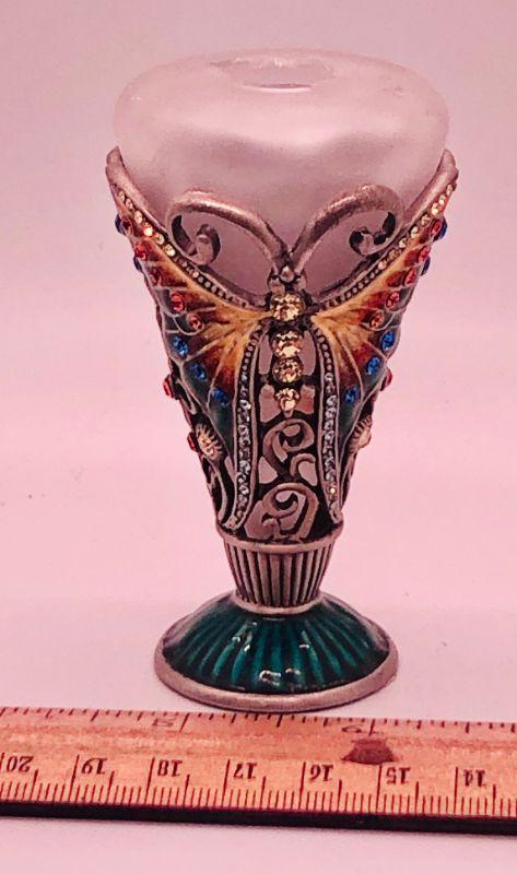 Beautiful rhinestone and enamel butterfly bottle. Stands about 3.5". Unfortunately the top has been broken off. Great for repurposing, to pretty to throw out.