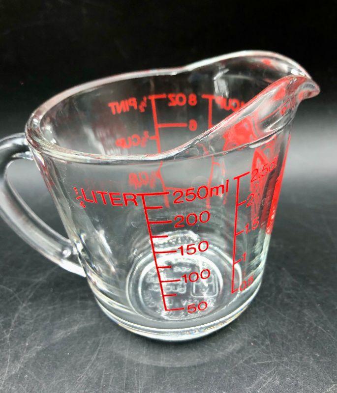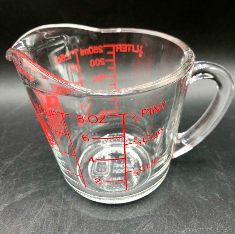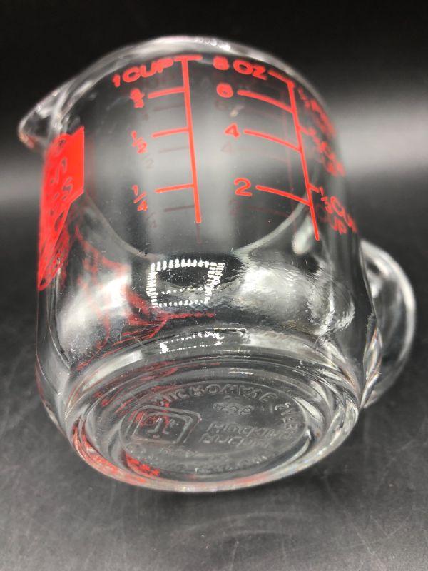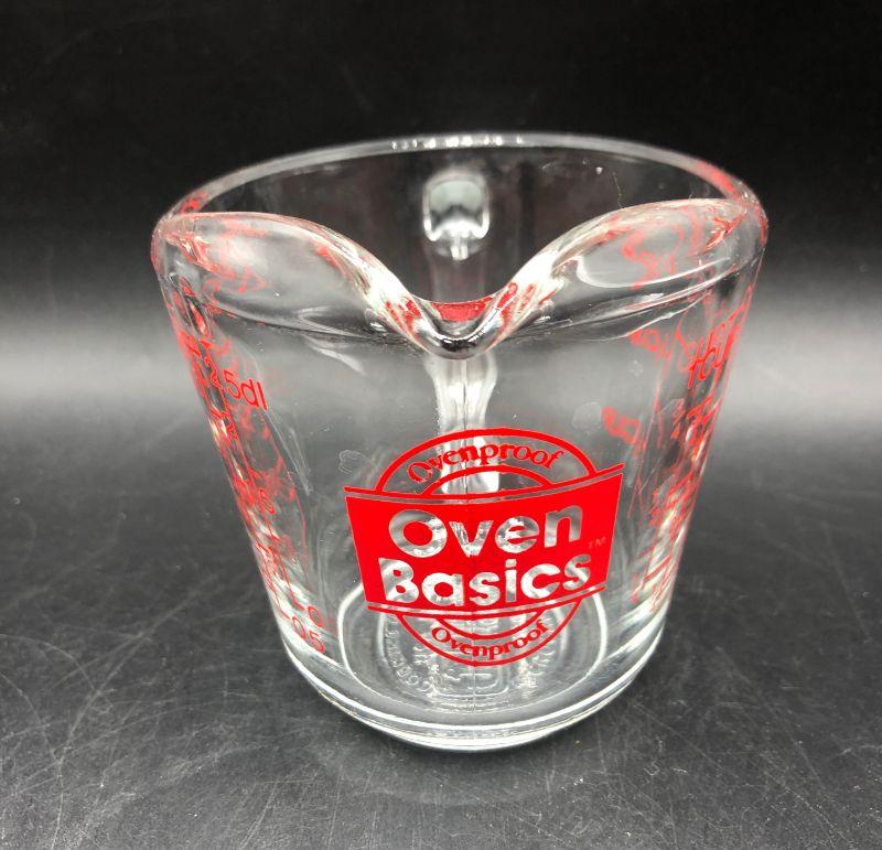 Oven Basics by Anchor Hocking, measures up to 1 cup/250 ml. Microwave safe. 3.5" tall.