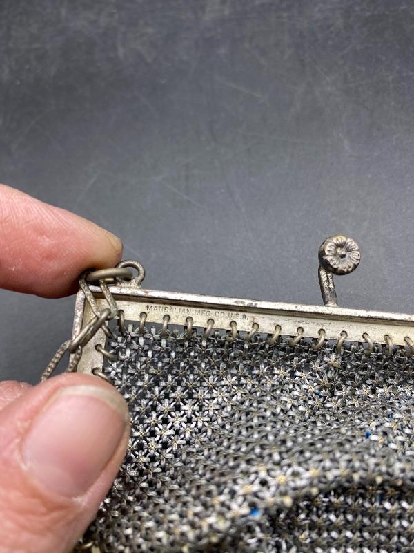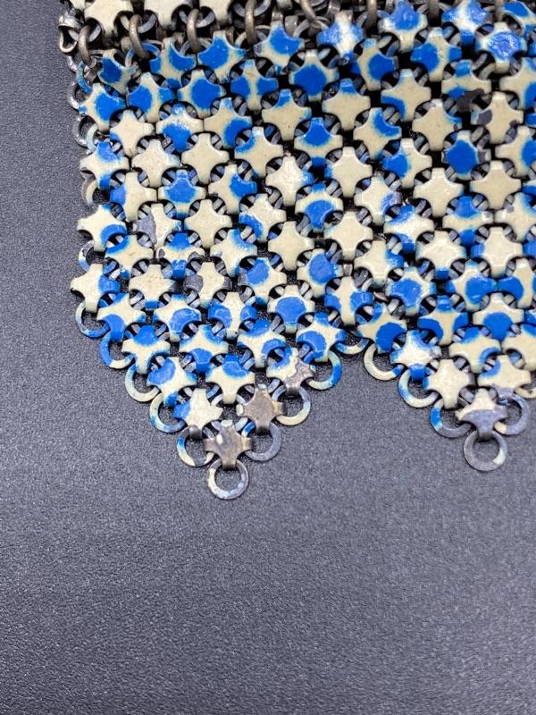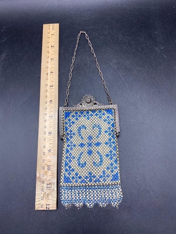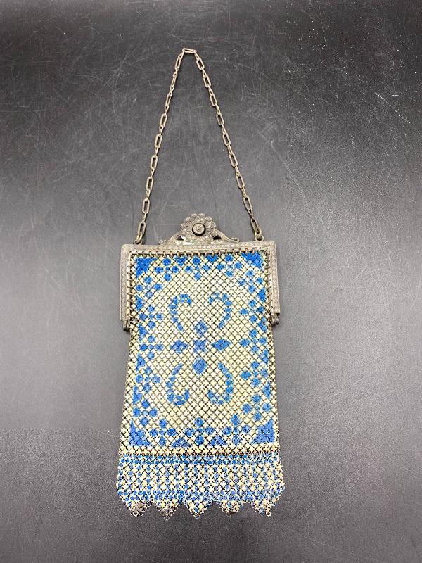 Antique Mandalian Mfg enamel mesh purse. Blue and white enamel in a Art Deco geometric design. Small size, only about 6" without chain. Company name on inside of frame. No holes, only noticed a couple bottom links missing enamel.