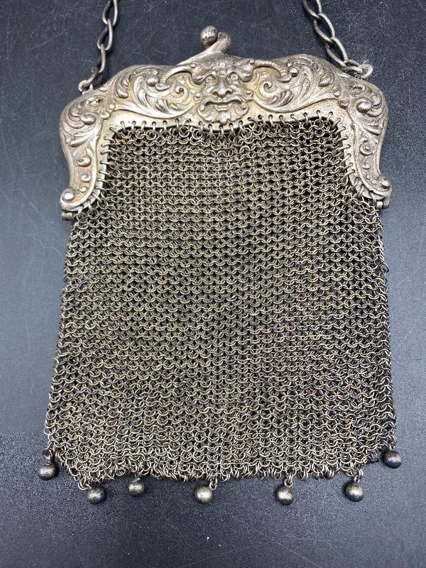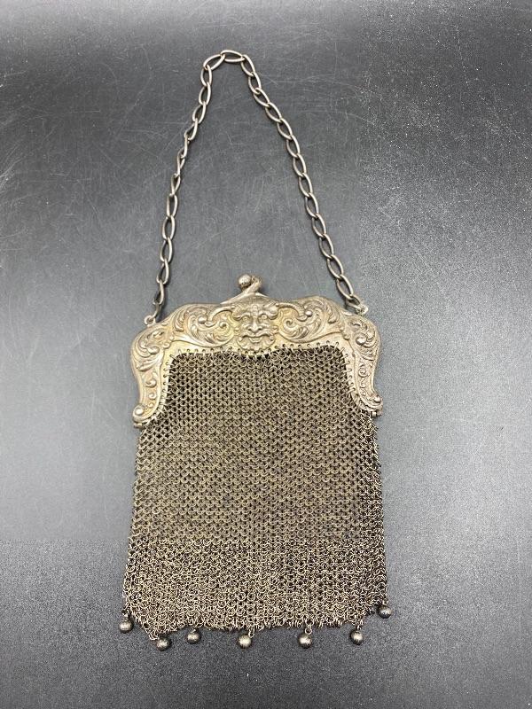 Antique sterling silver chainmail mesh purse. Hallmarked & stamped sterling inside. Great figural face on the frame. Purse is about 6" without chain. There is a few links in the mesh that need repair, but no large holes or damage.