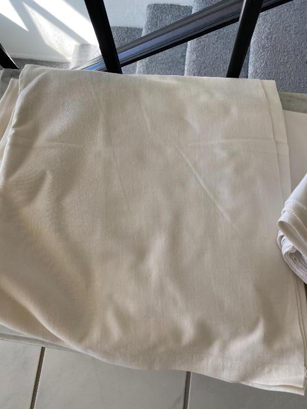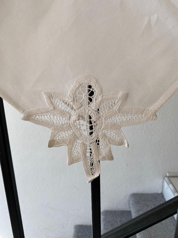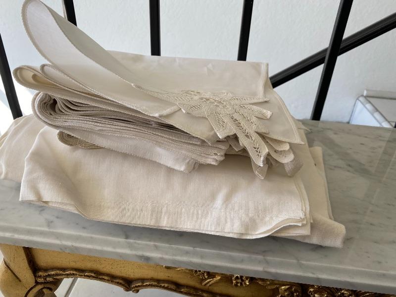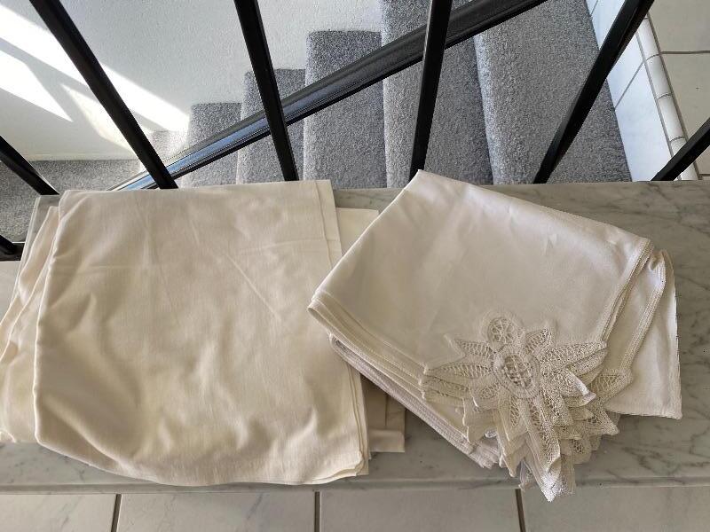 Lot of white dinner linen napkins and table cloth. Floral lace corner on napkins. May be light spots or discolor.
