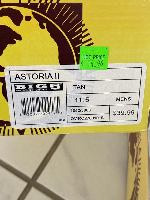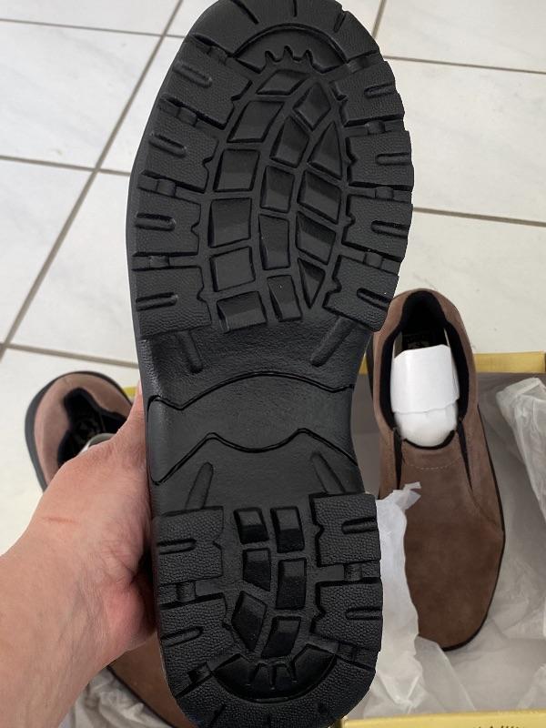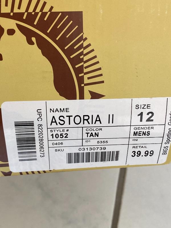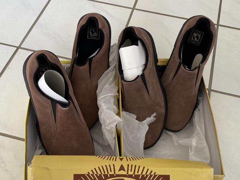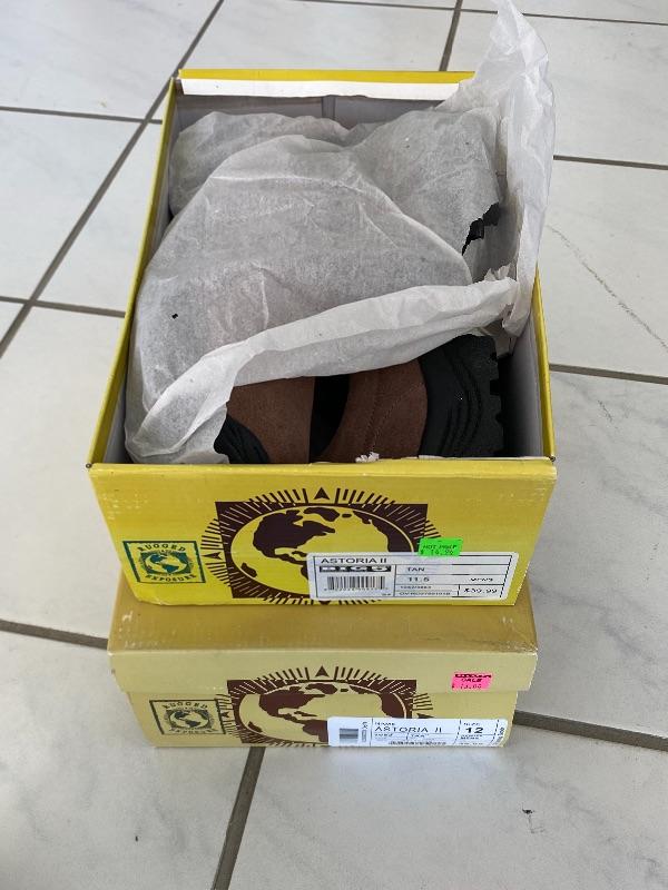 Two pairs of tan Astoria II slip on shoes. Have tread similar to a hiking shoe. New, unworn. Size 11.5 & 12.
