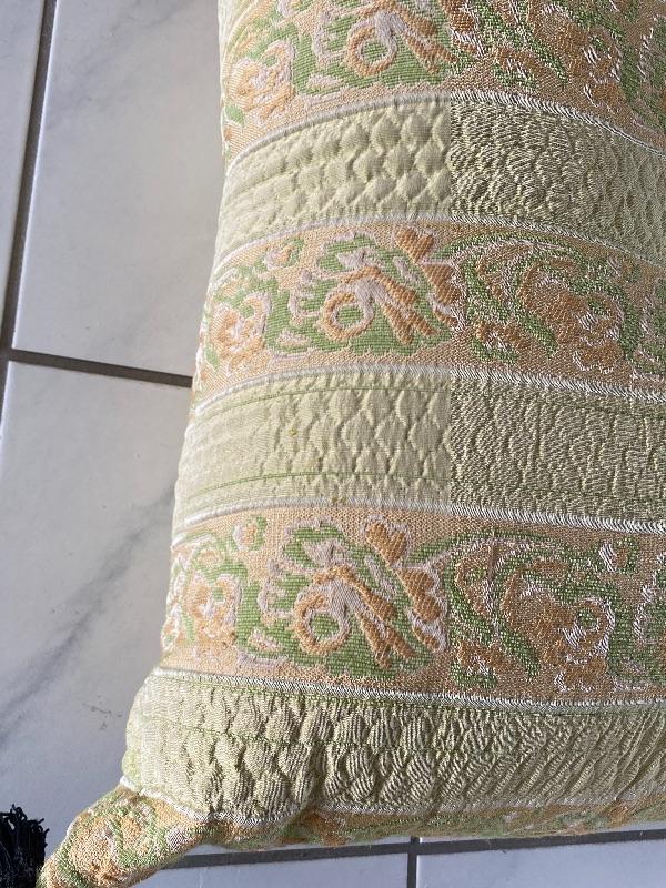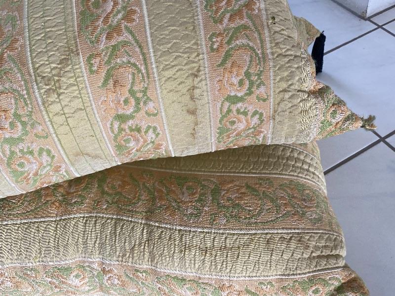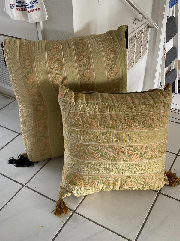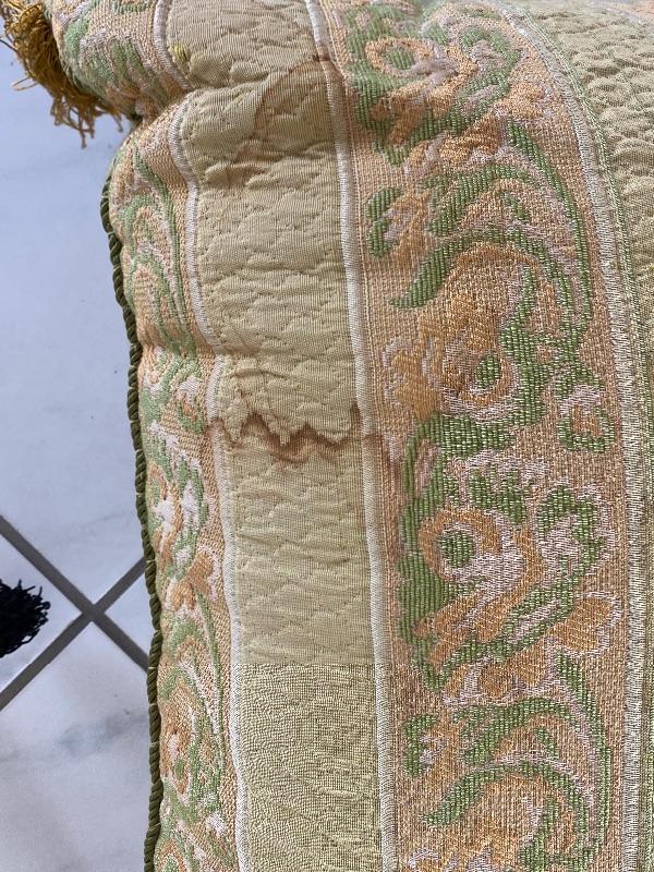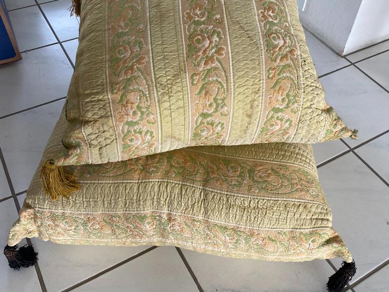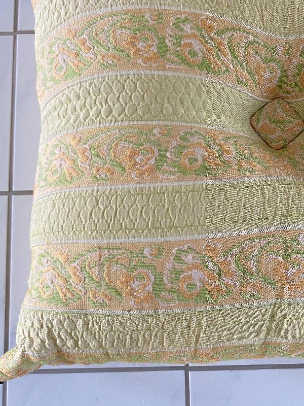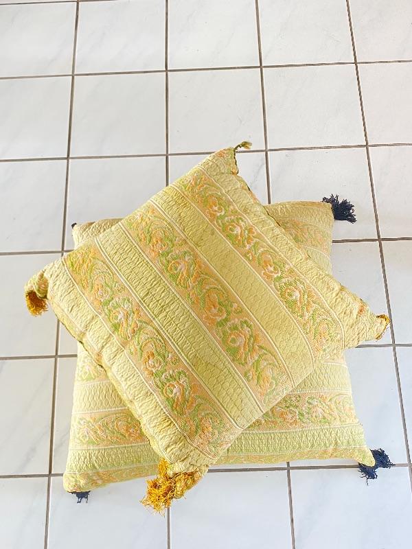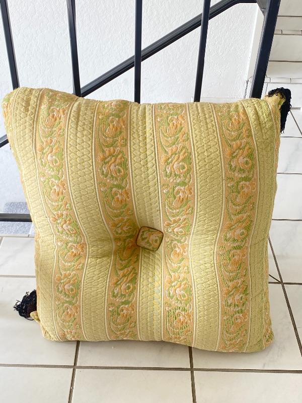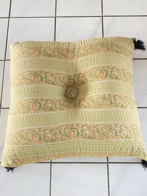 Large vintage boho style floor cushion pillow seats. Kind of a yellow green floral pattern, hard to photo the colors correctly. There is what looks like water stains, not sure if an overall cleaning will remove. Over 2' square in size.