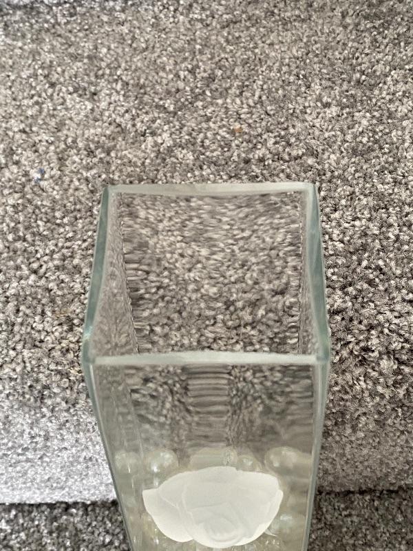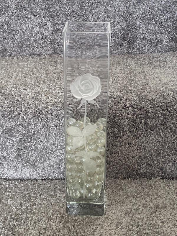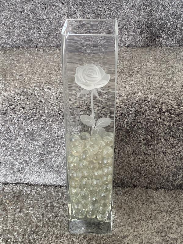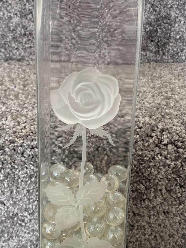 Square glass vase with a frosted rose on one side. Clear marbles fill about half way. Good condition. No maker marks. About 12" size.