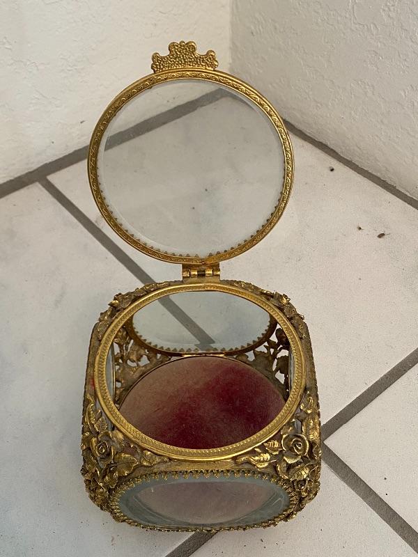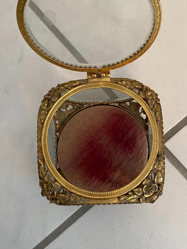 Vintage gold gilt jewelry casket by Matson. Hinges lid, glass sides and top, removable velvet bottom. Signed on inside of leg. About 4" square size. Velvet has faded, can be replaced.