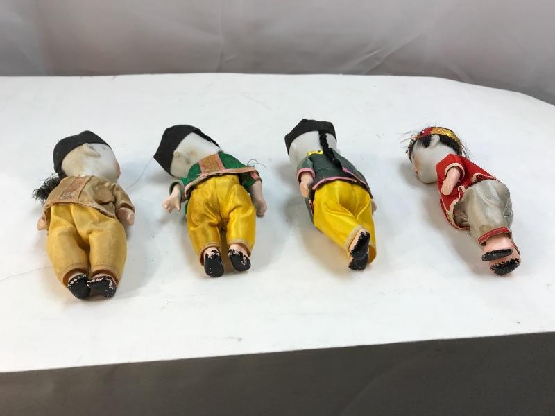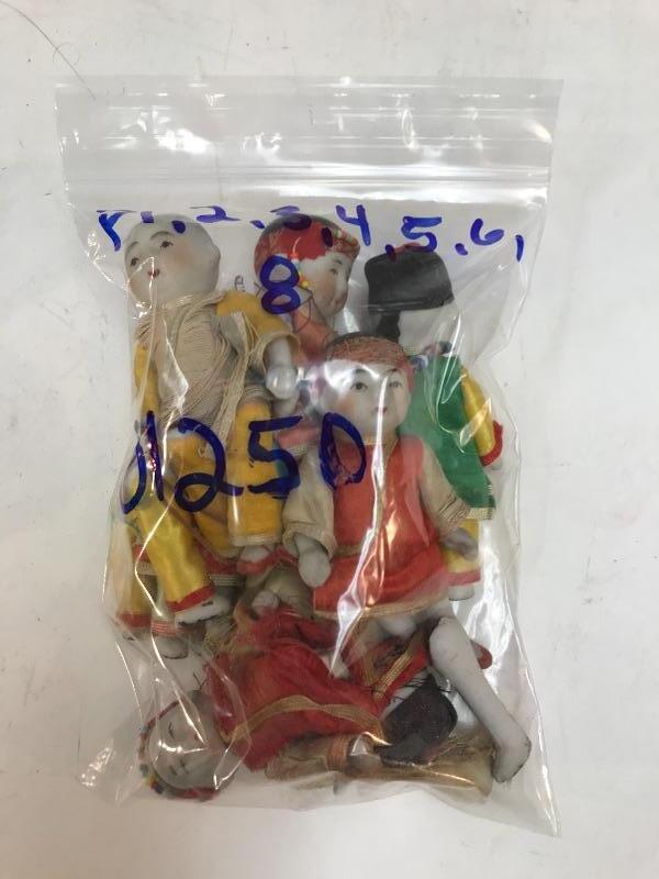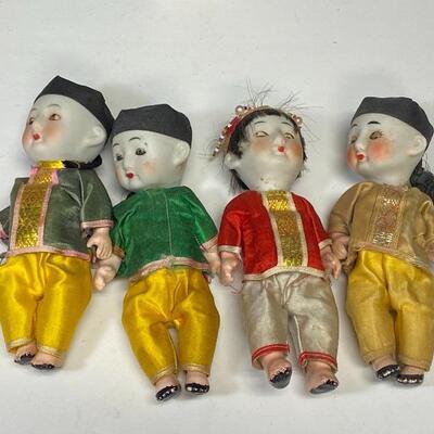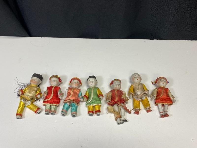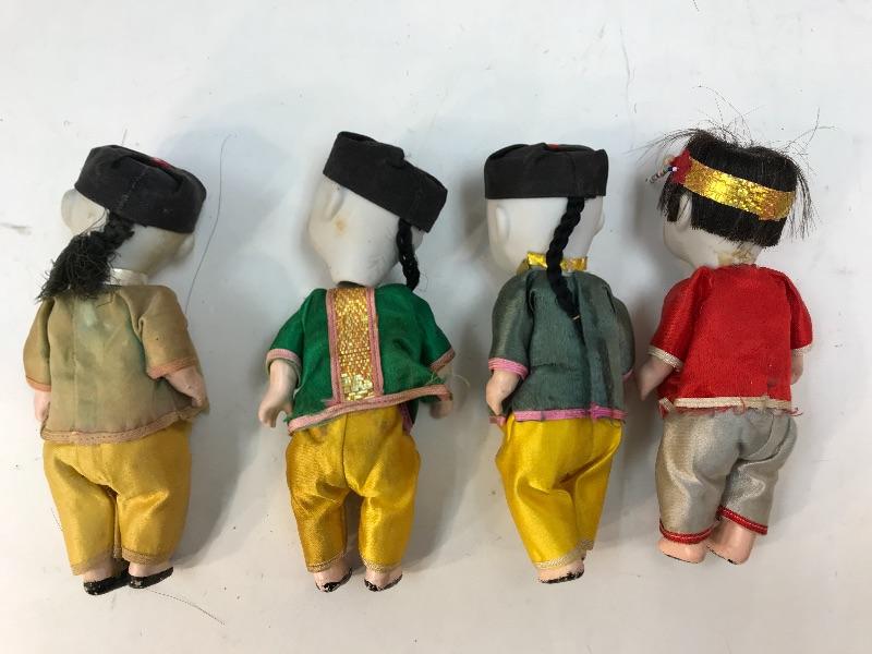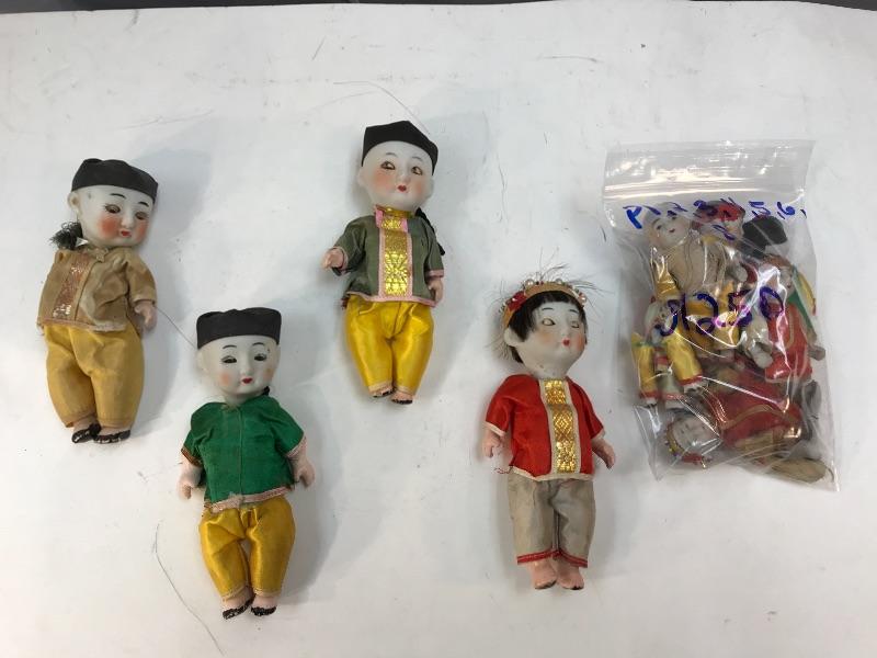 Mixed lot of Asian jointed dolls. Most likely originally sold as souvenirs. Set of 4 vintage bisque/composite Asian dolls. Sleepy eyed dolls, on the odd side as 3 have solid black eyes. All have signs of age, loose strings, wear to composite paint. They are marked on the back of the neck. There is a small wood like box under their shirts, these were once squeaker dolls, but do not make nice anymore. About 5.5" size. Probably sold as souvenirs during the 1950s 1960s. Set of 7 bisque Asian jointed dollhouse dolls. A few are marked made in Japan. While the face paint looks okay the clothes on most of these are falling apart, a couple need legs restrung. Online research shows they originally were sold in boy/ girl pairs in little straw boxes, like souvenirs. About 3.5" size.