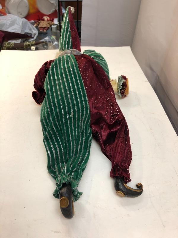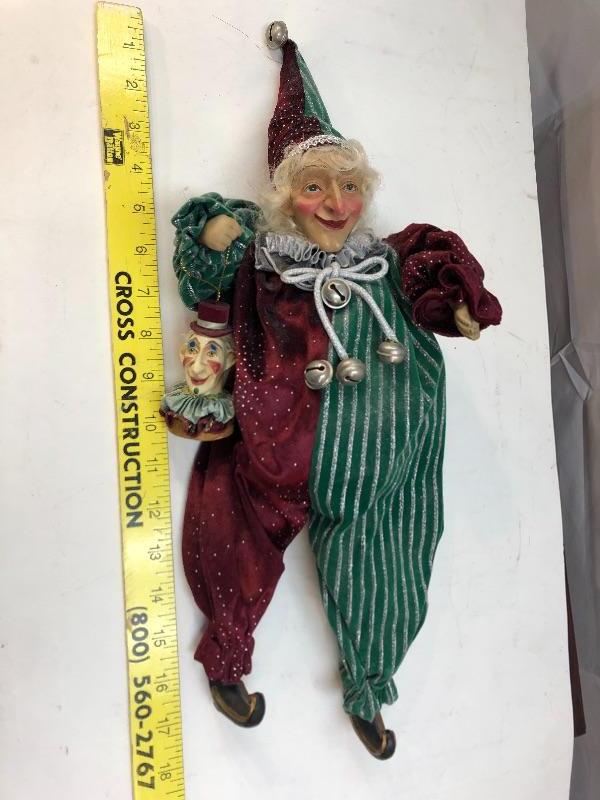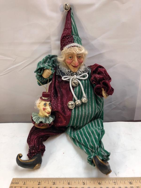 Green and burgundy jester clown. Holding a clown head ornament. About 16", no tag.