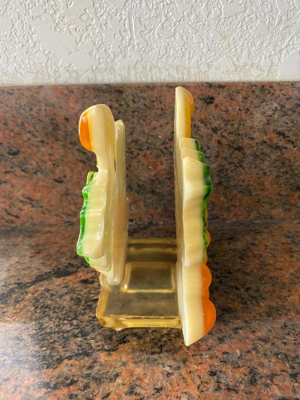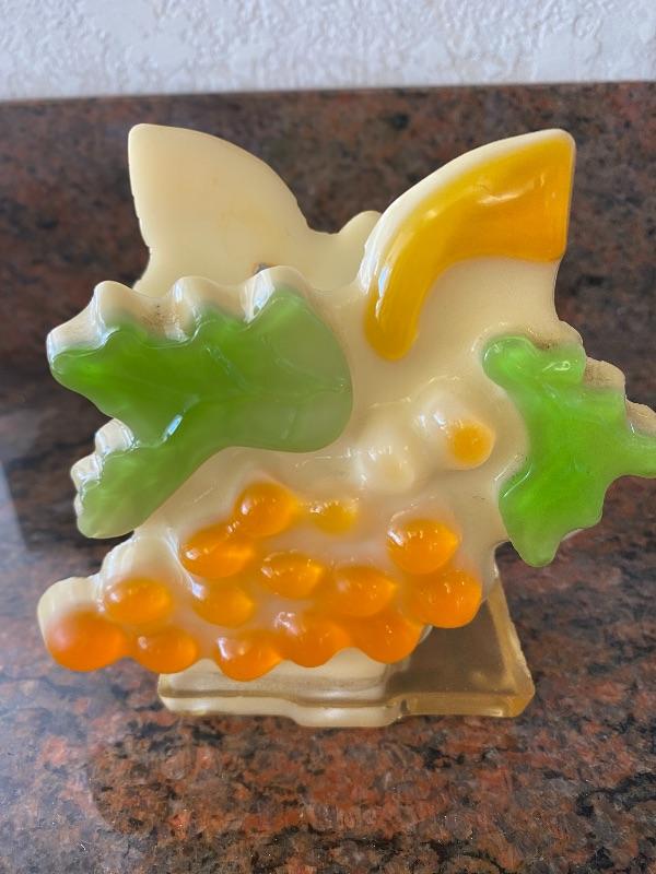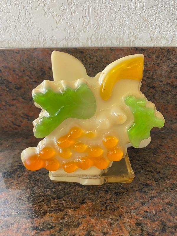 Cool vintage lucite resin napkin holder. Yellow orange bunch of grapes with green leaves. A little dusty but good condition.