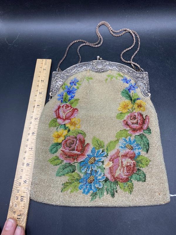 Antique floral microbead purse. Colorful flower pattern on both sides, a few small spots of wear/missing beads. Top closure clasp is stamped 800 silver, features flowers and cherubs. One pocket inside. The handle/strap has been replace with a sterling necklace. Measures about 10"x8" not including the chain.