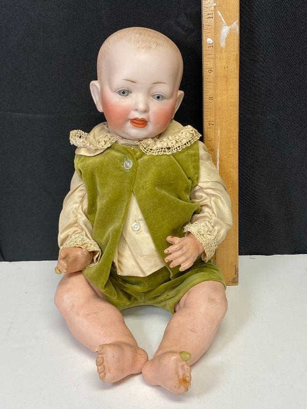 Antique 15" bisque & composite boy in green velvet doll. I believe it is an old Hertel Schwab doll from looking online but the only mark on head is maybe a 6 over 151. Doll does have some wear. Eyes are a bit on the creepy side. Fingers and toes have been repaired.