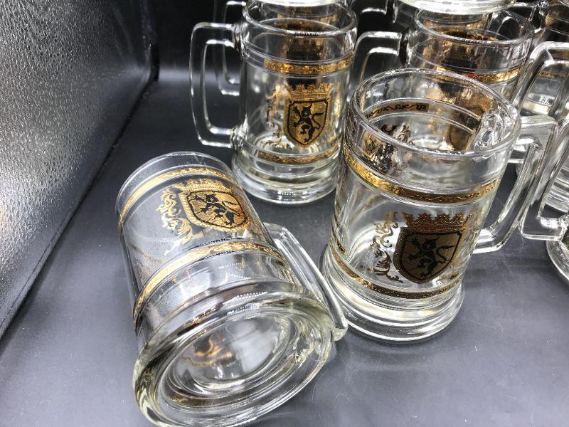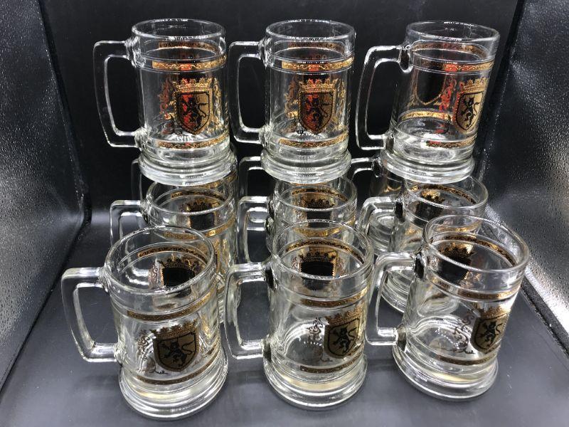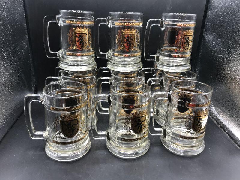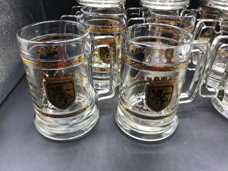 Set of 12 glass tankard mugs. Clear glass with gold lion coat of arms shield on one side. Good condition.