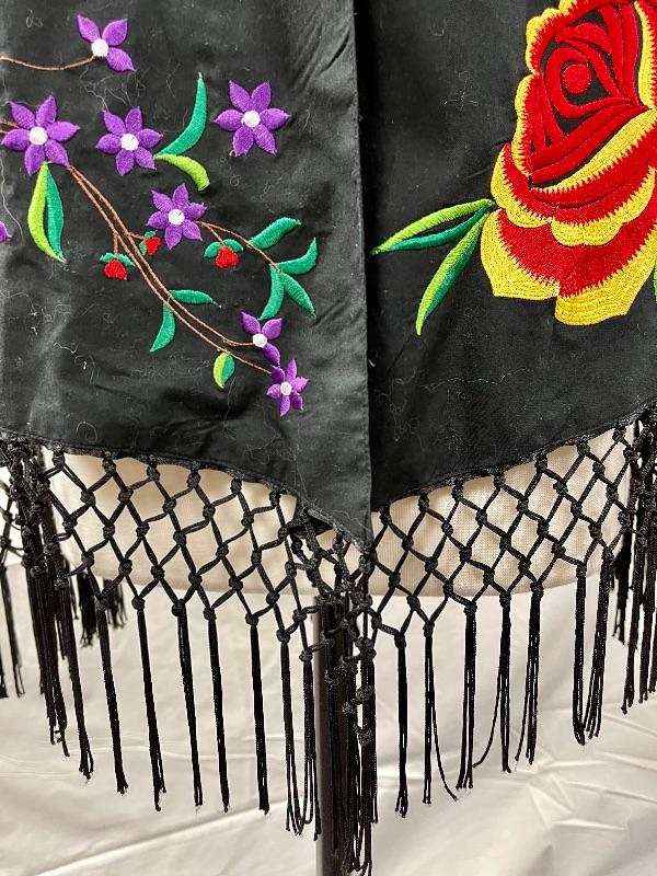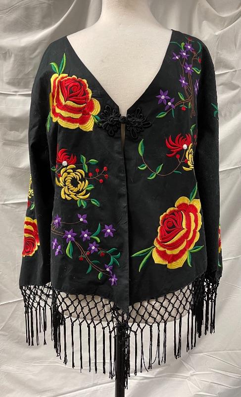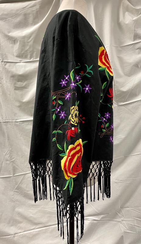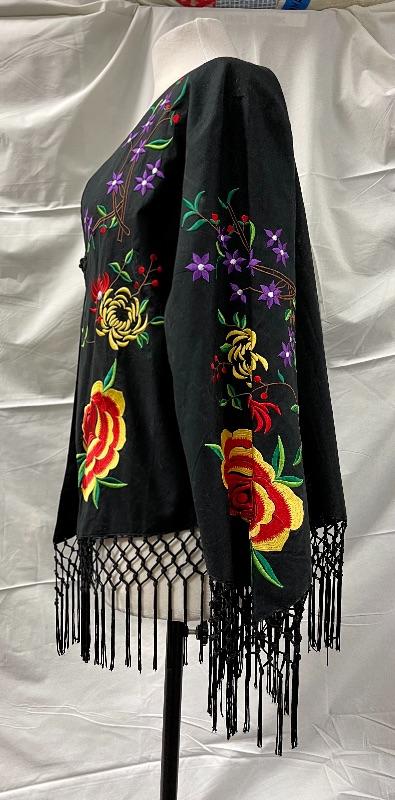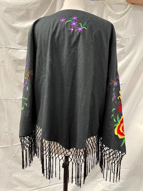 Colorful Flower Embroidered Black Fringed Shawl Coat Jacket Size XL