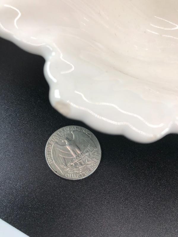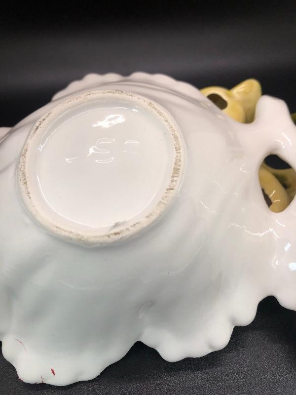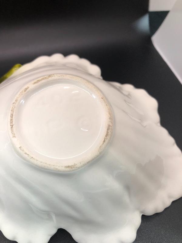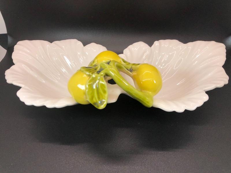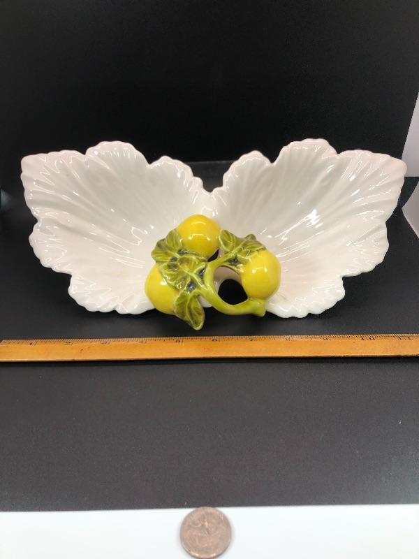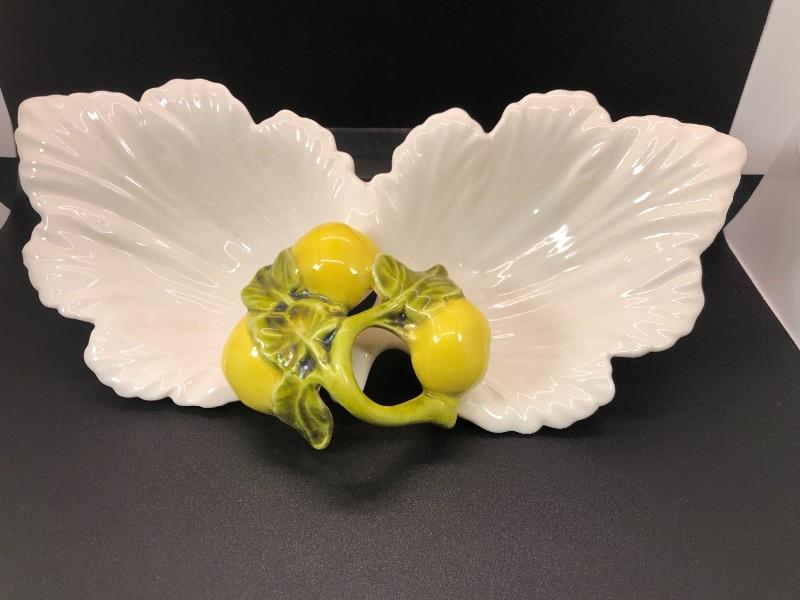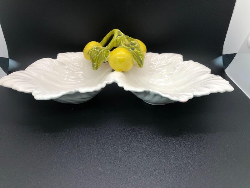 Vintage USA pottery serving dish. Double bowl serving piece in a leaf and lemons design. Marked USA on the bottom. About 12" size. Small chip along the edge. #020-0415a10