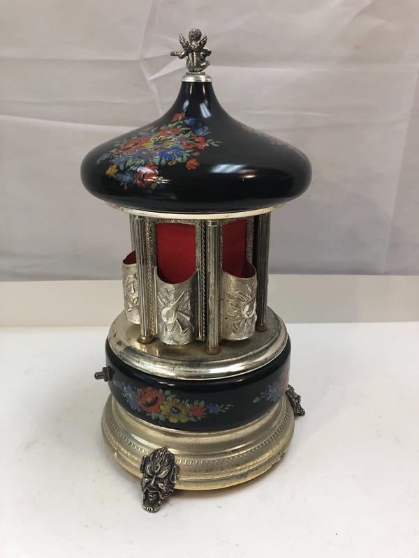 Vintage Reuge music box. Interesting Italian music box is a lipstick holder, doors open and close. In great vintage condition. Works, plays "Raindrops Keep Falling On My Head". Black with flowers on the outside, silver tone inside. A little over 12" tall. #022-0470