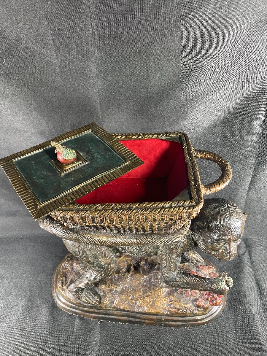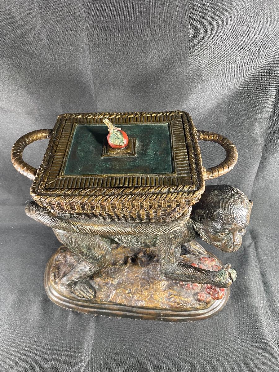 Maitland Smith Monkey Carrying Basket Lidded Planter Statue Cast Iron Bronze