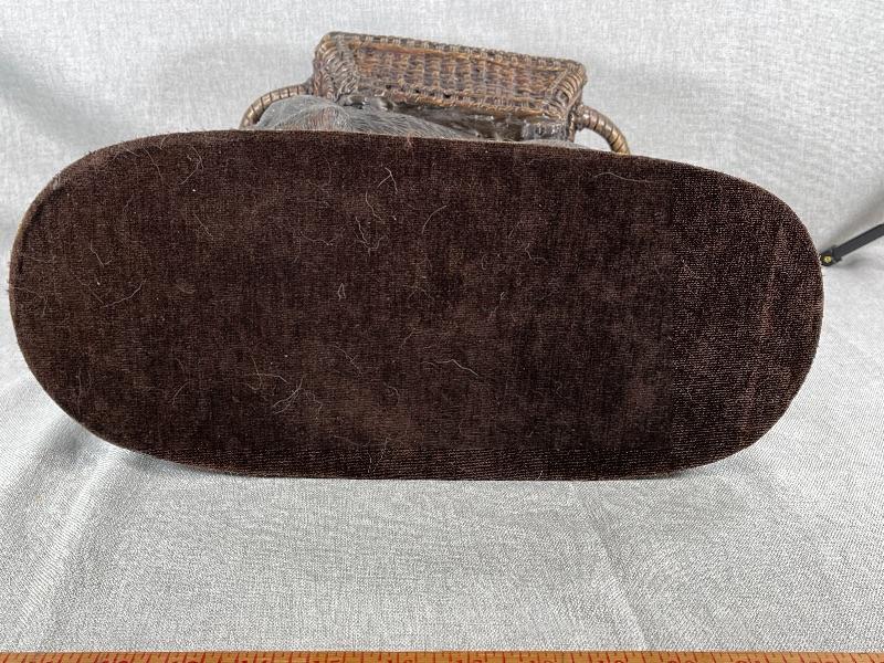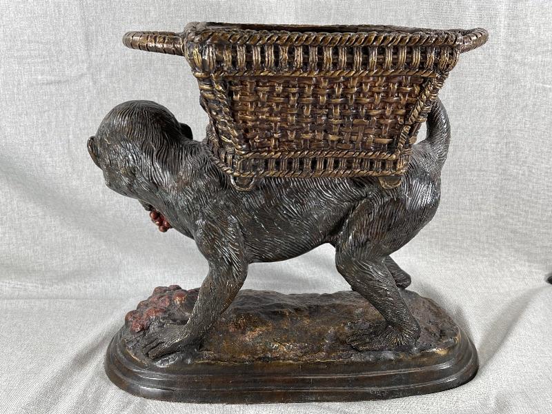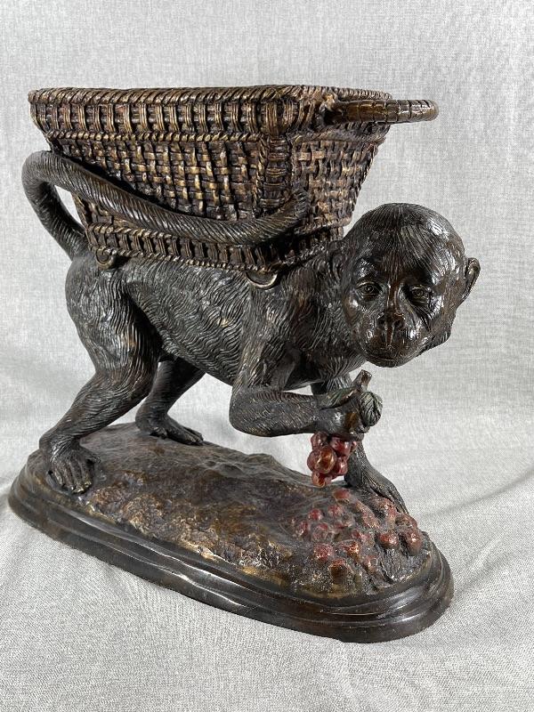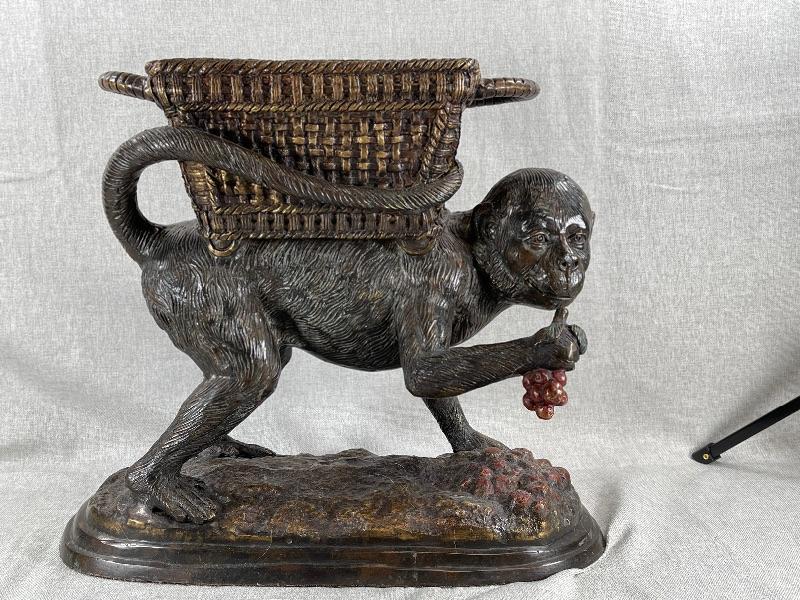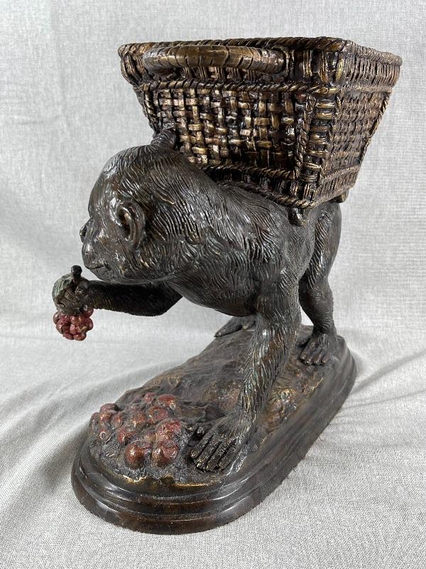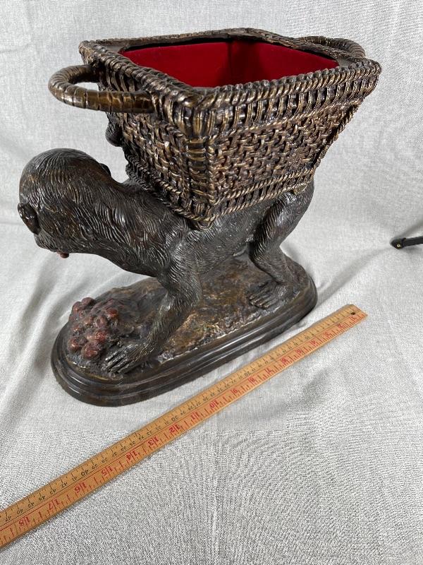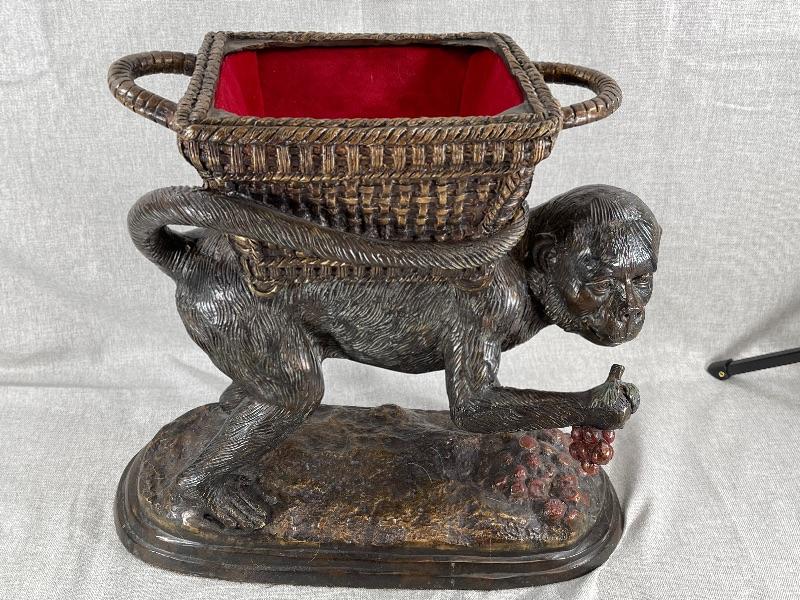 Interesting monkey with basket on back planter statue. Very heavy, measures about 12" tall. Monkey is eating grapes. Basket on back is lined and has a lid. Use for inside or outside decor. #020-00188