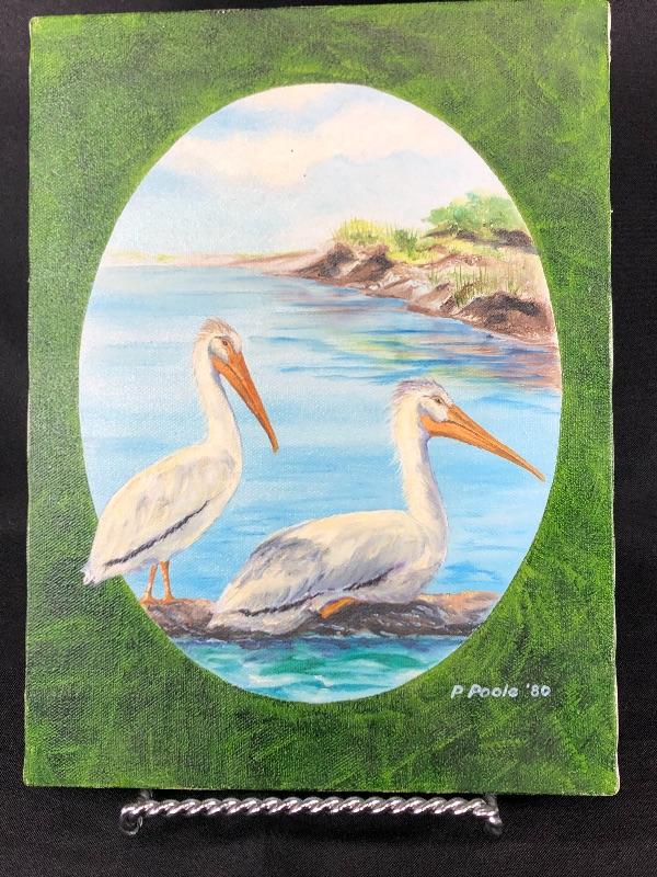 Vintage pelican wall art signed P. Poole 1980. Unframed, good condition. 12x9