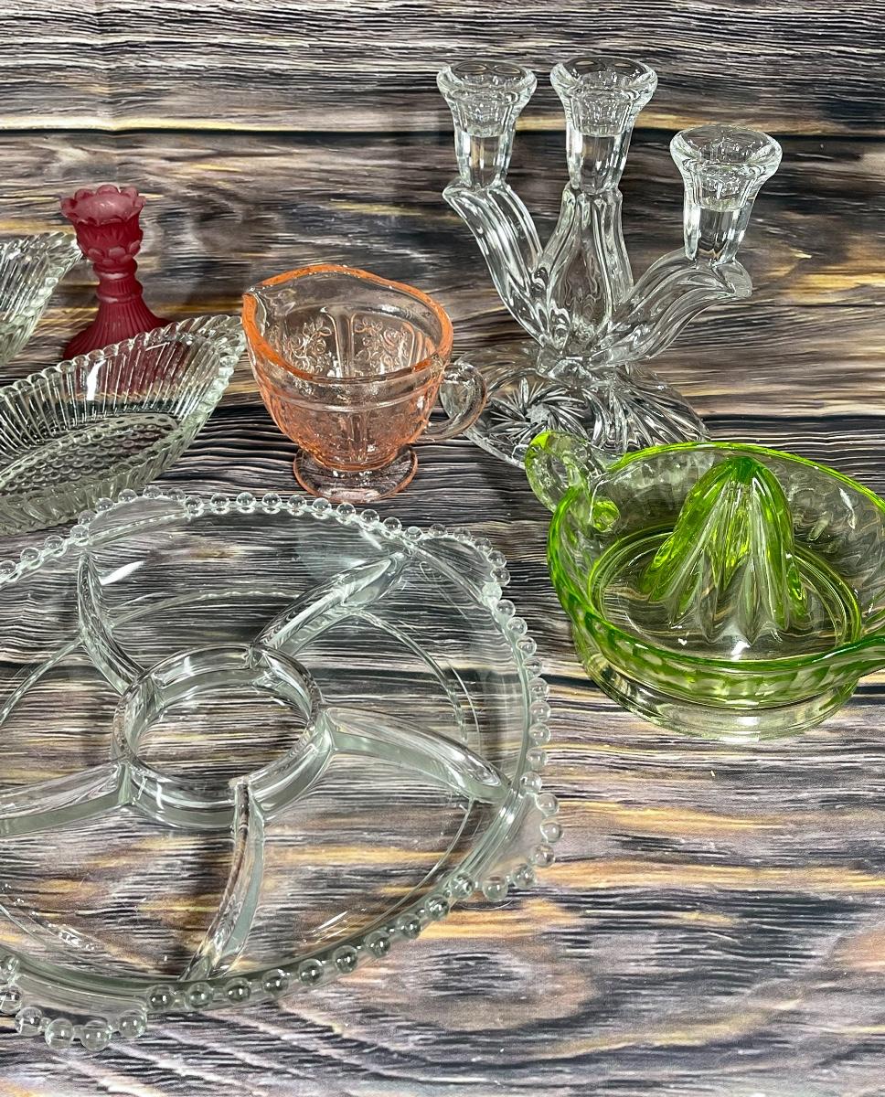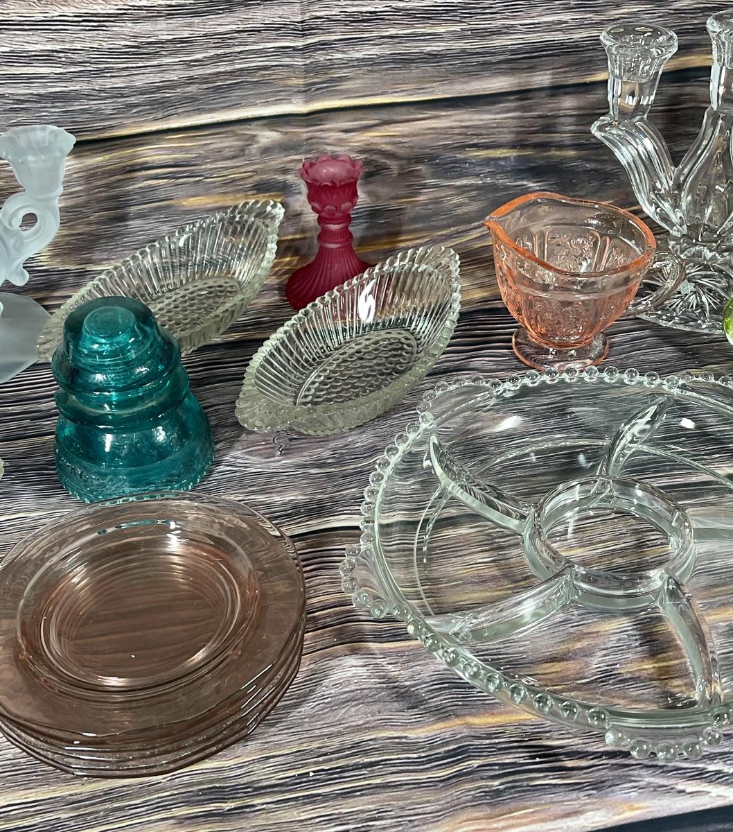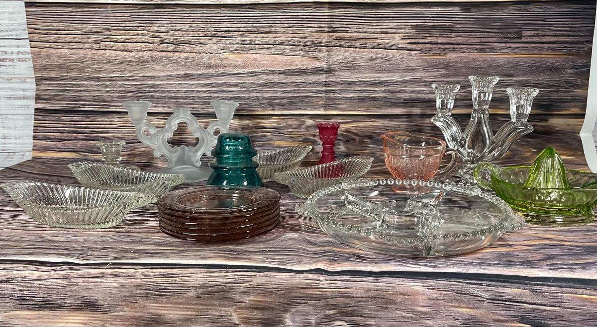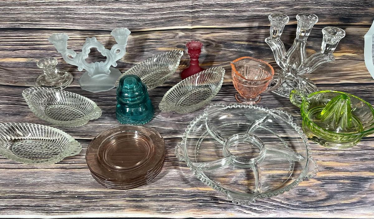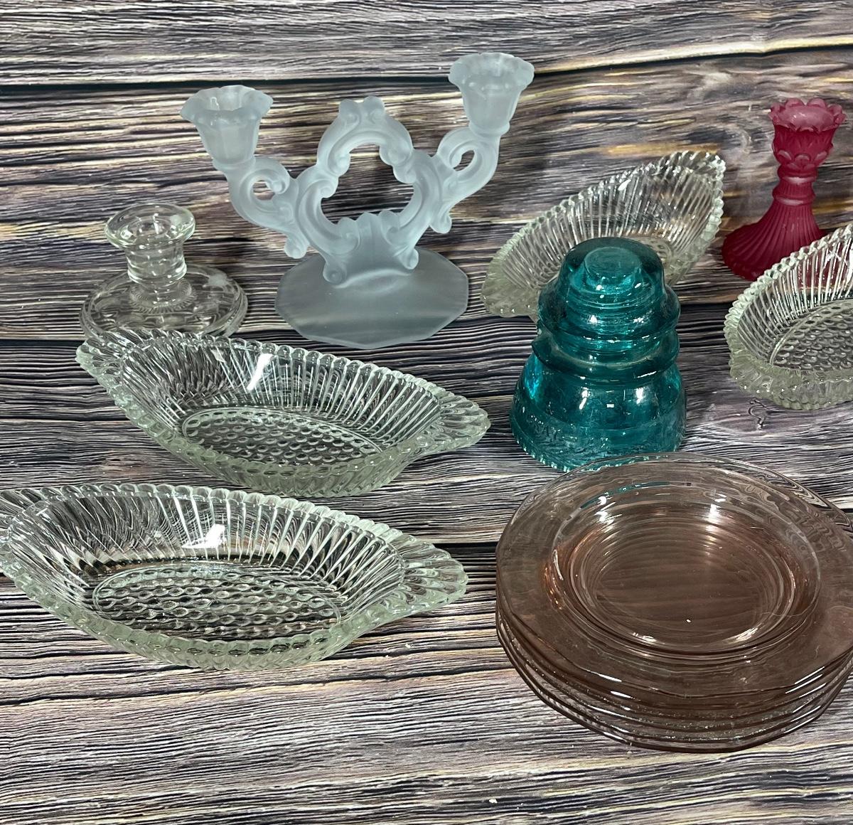 Mixed lot of vintage clear and colored glass. Serving pieces and candleholders. Good vintage conditions. May have a chip or two.