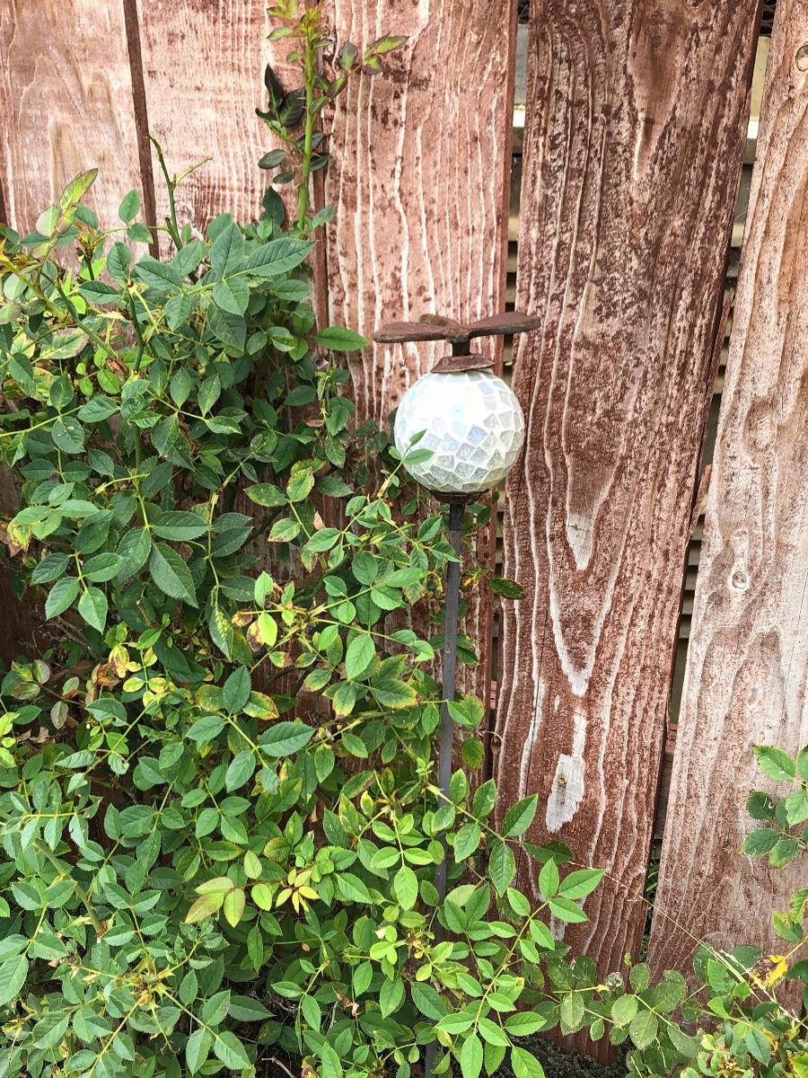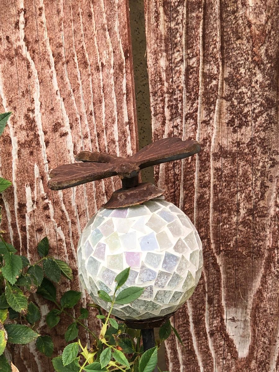 Dragonfly on Mosaic Ball Garden Yard Stack Art. Weathered.