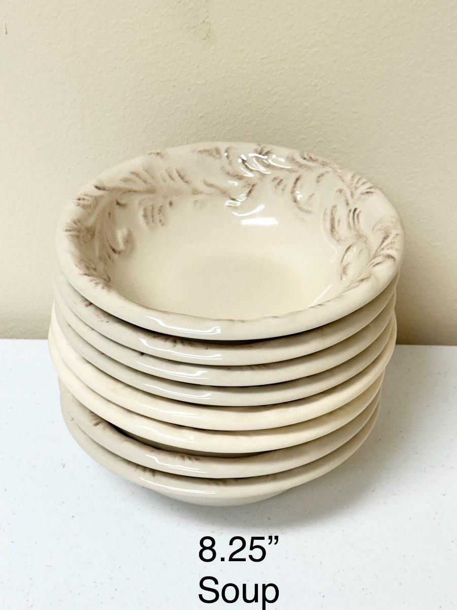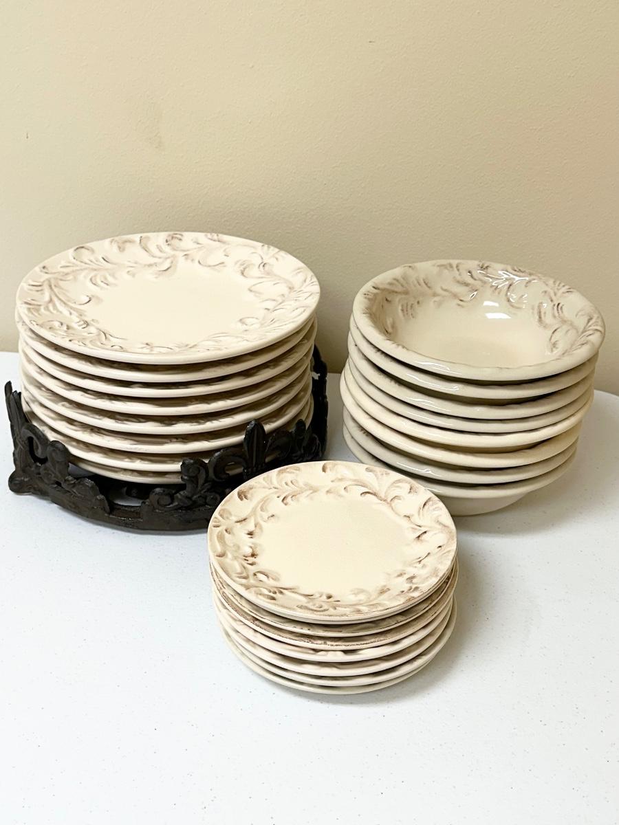 25 pieces total: 8 dinner plates, salad plates and soup bowls. Plate stand ~