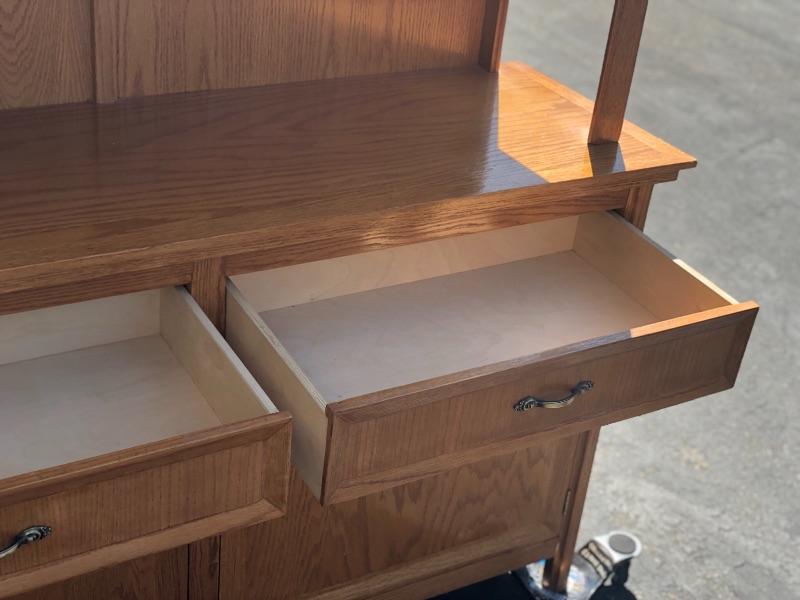 Nice medium finish wood cabinet with glass hutch. Two drawers and cabinet below, Beveled glass hutch with two shelves on top.